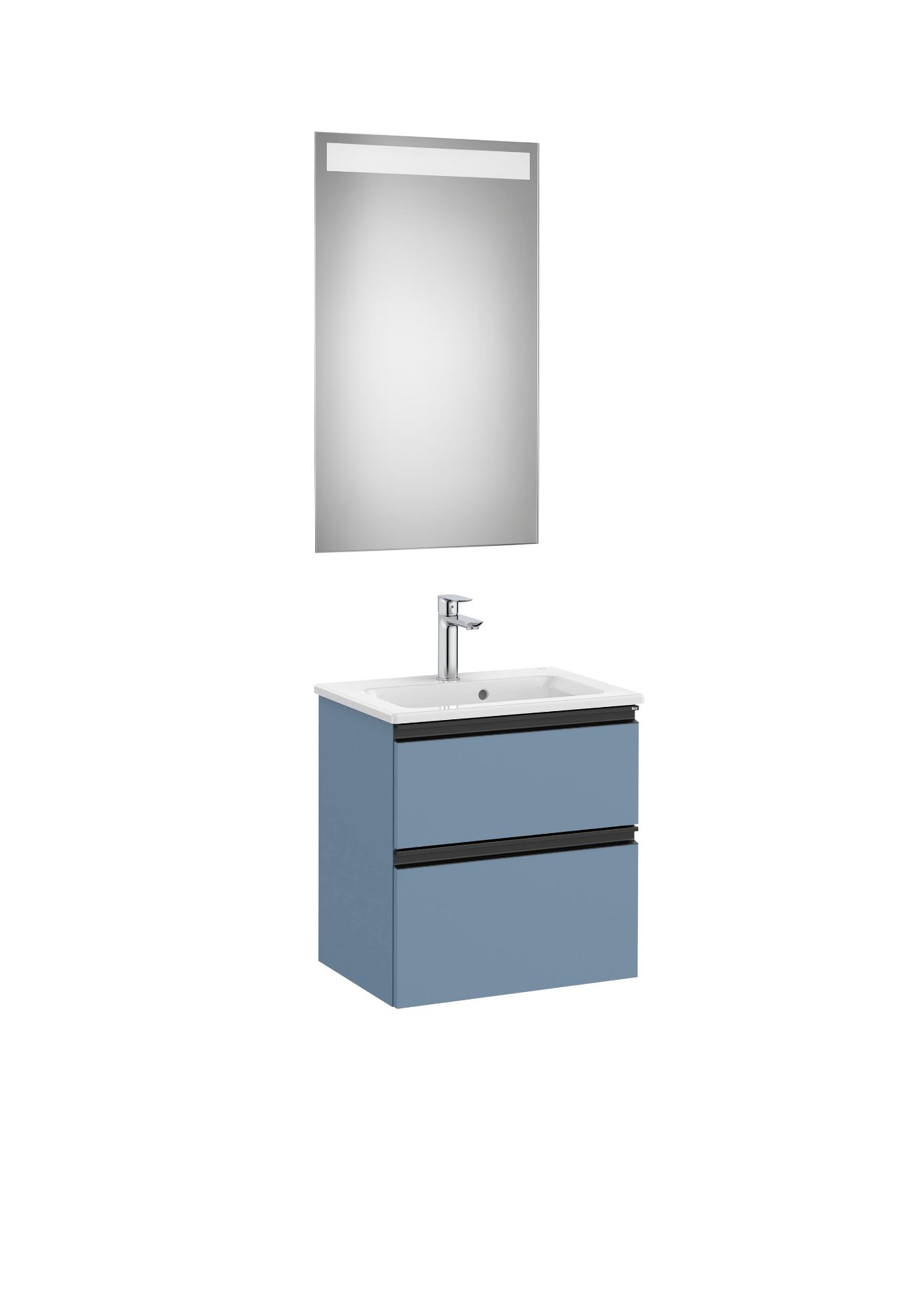 Pack GAP compac . Conjunto de mueble base dos cajones modelo GAP con lavabo compacto fondo reducido y espejo EIDOS . Acabado azul mate medida 500x380. Cajones con cierre amortiguado. No incluye grifería