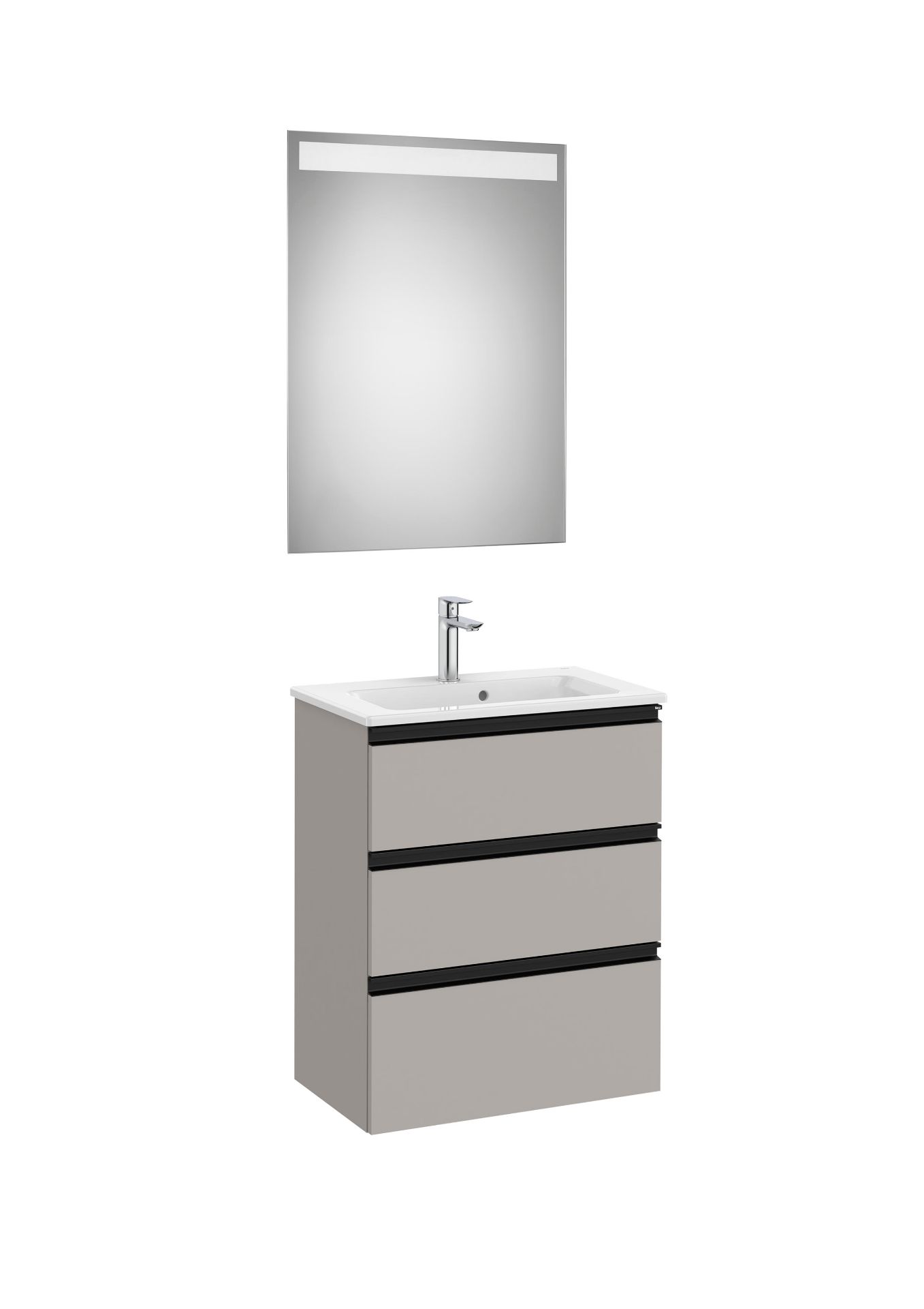 PACK - Conjunto de mueble base compacto de tres cajones con lavabo y espejo Eidos con luz LED integrada en la parte superior. No incluye patas ni grifería.