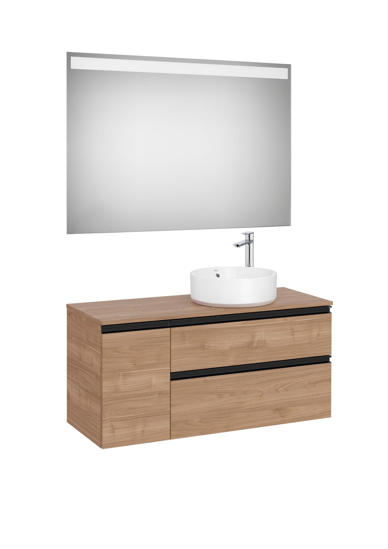 PACK - Conjunto de mueble base de dos cajones para lavabo de sobre encimera en posición derecha y espejo Eidos con luz LED integrada en la parte superior. No incluye lavabo, patas ni grifería.