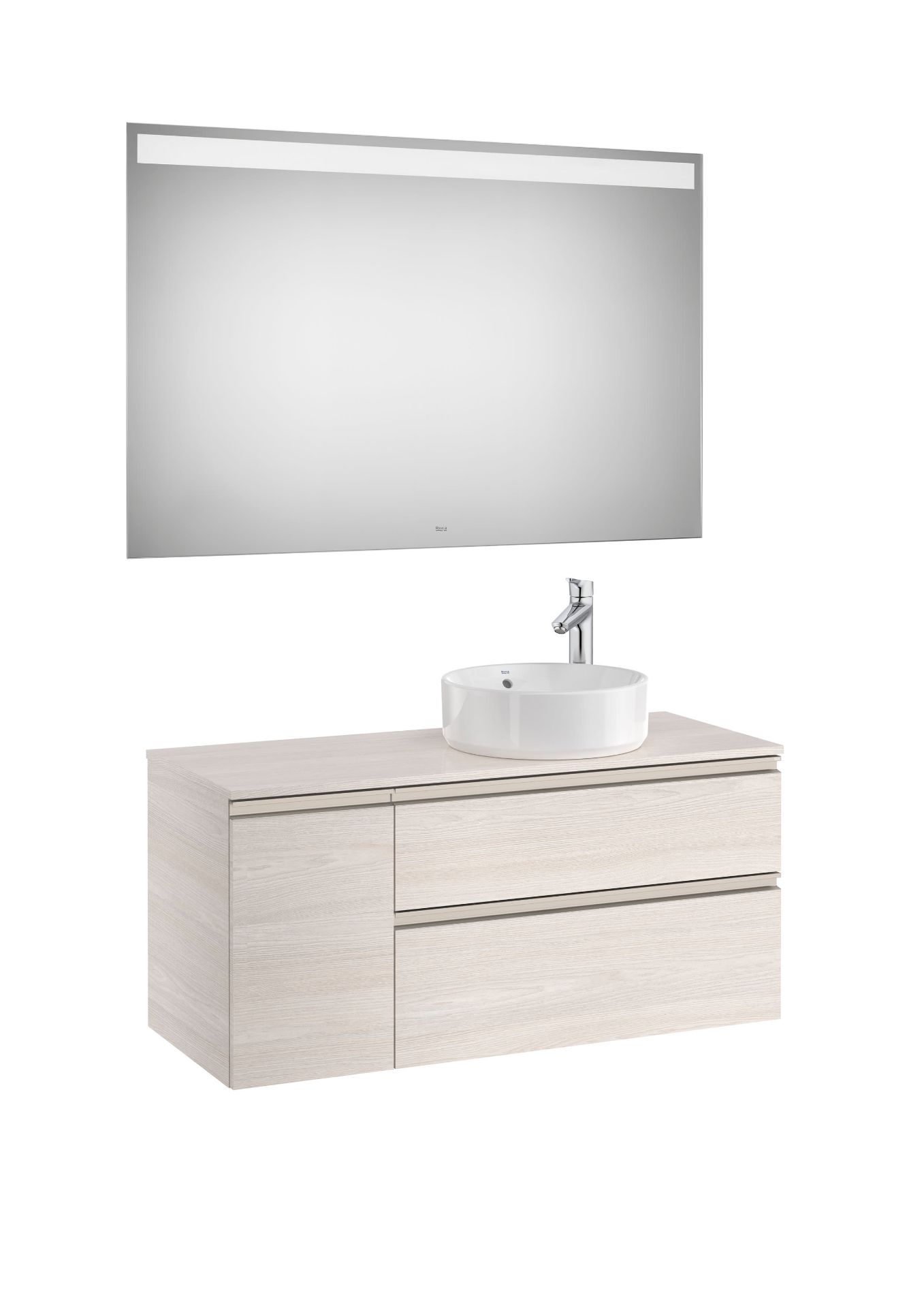 PACK - Conjunto de mueble base de dos cajones para lavabo de sobre encimera en posición derecha y espejo Eidos con luz LED integrada en la parte superior. No incluye lavabo, patas ni grifería.
