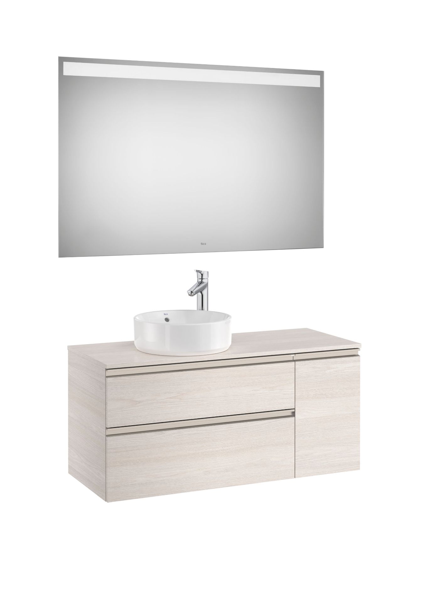 PACK - Conjunto de mueble base de dos cajones para lavabo de sobre encimera en posición izquierda y espejo Eidos con luz LED integrada en la parte superior. No incluye lavabo, patas ni grifería.