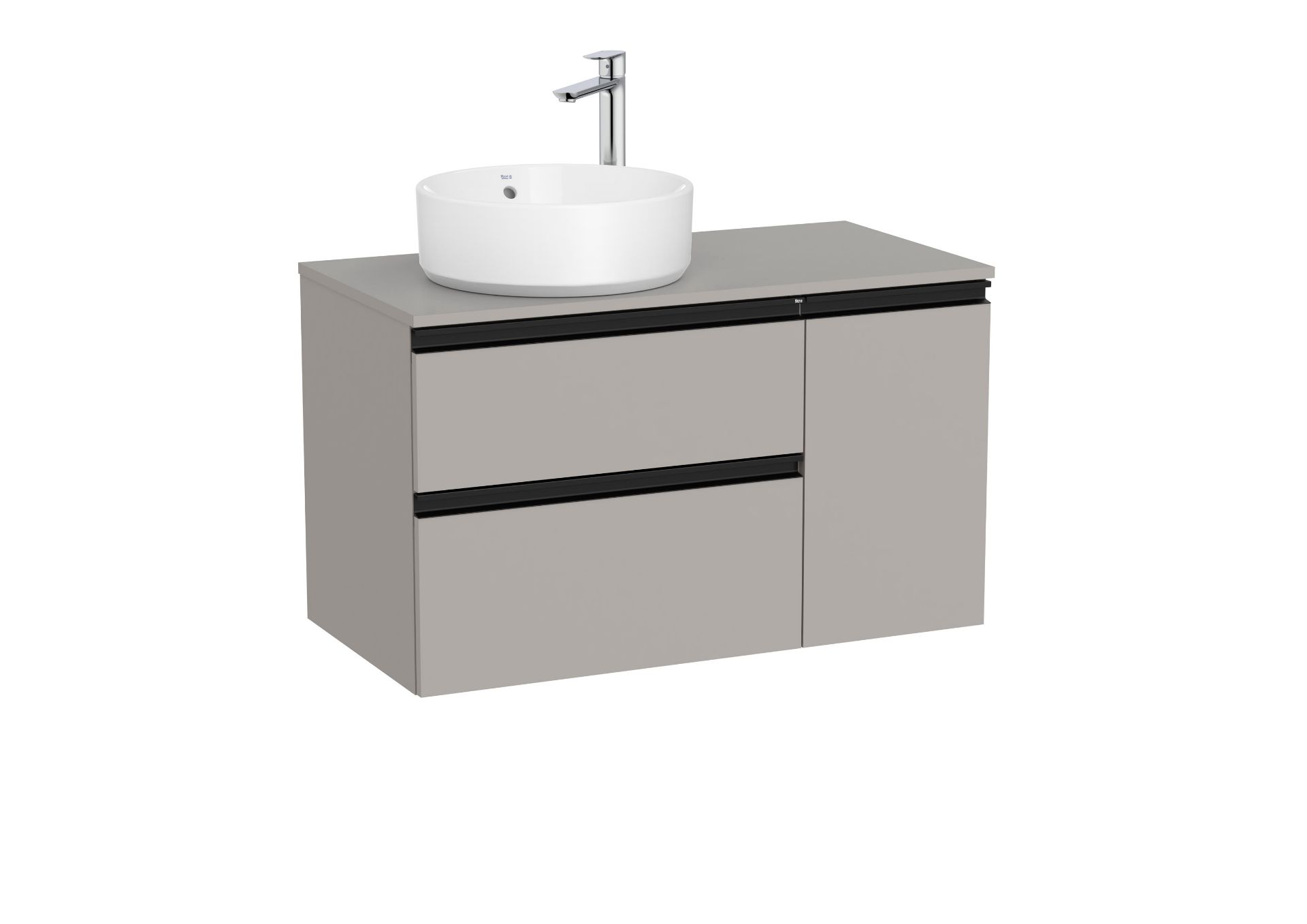 Unik GAP. Compuestos por mueble base modelo GAP 2 cajones y 1 puerta para lavabo sobreencimera compatible desplazado a la izquierda. Acabado gris mate medida 900x460. Cajones con cierre amortiguado. No incluye lavabo y grifería
