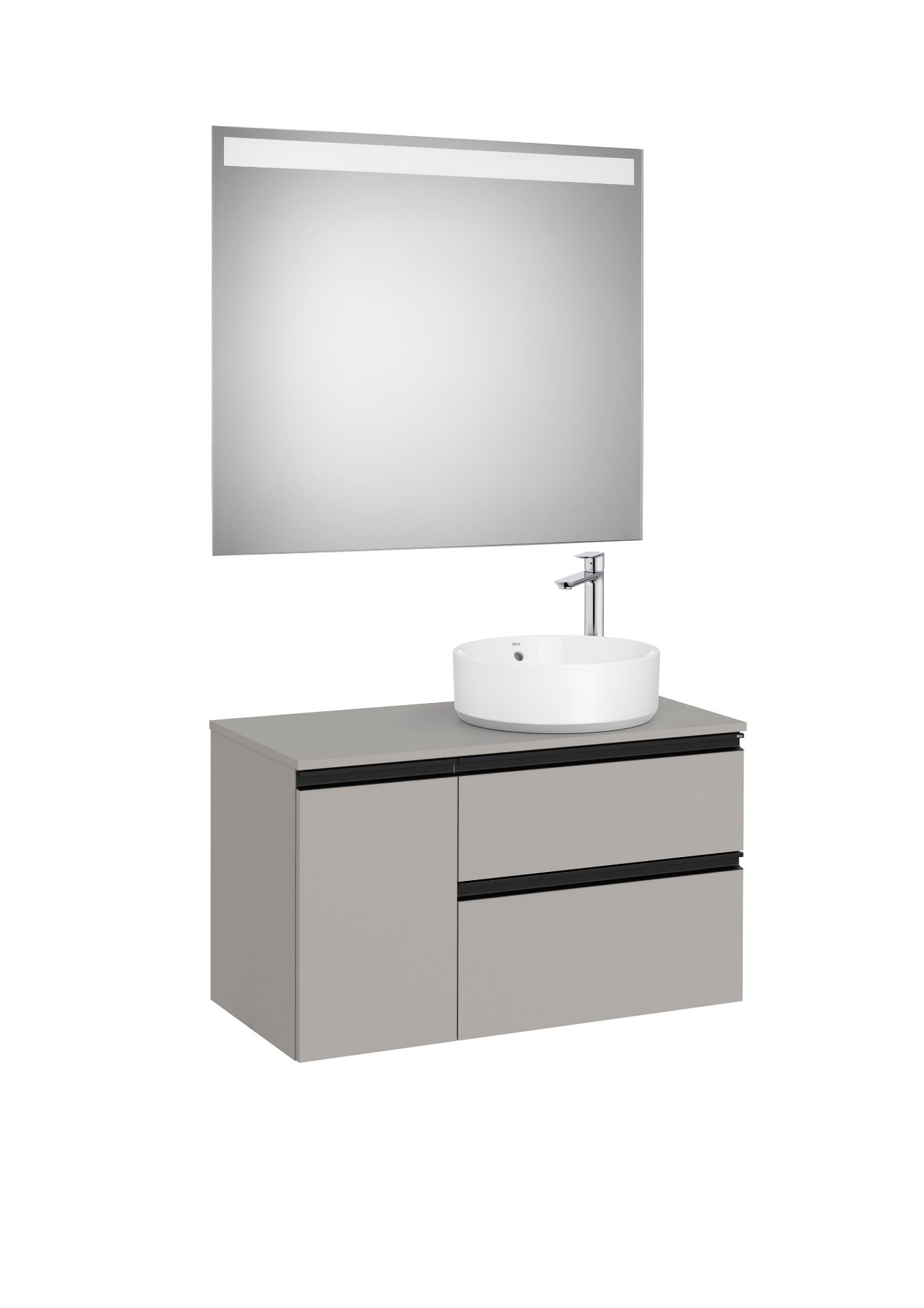 PACK MUEBLE ESPEJO Y LAVABO MODELO GAP 2 CAJONES y 1 PUERTA GRIS MATE PARA LAVABO SOBREENCIMERA DESPLAZADO A LA DERECHA MEDIDA 900X460
