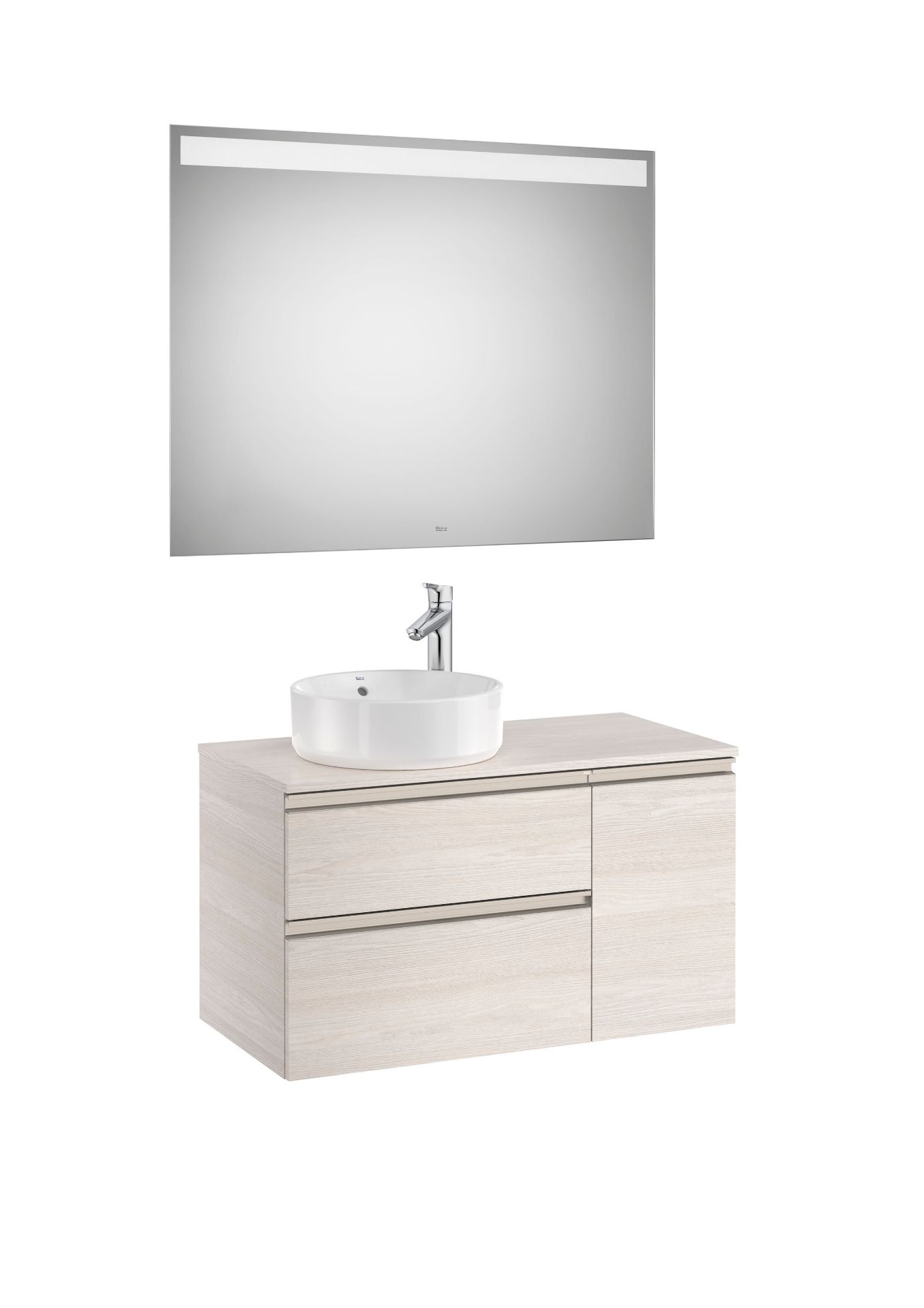 PACK - Conjunto de mueble base de dos cajones para lavabo de sobre encimera en posición izquierda y espejo Eidos con luz LED integrada en la parte superior. No incluye lavabo, patas ni grifería.