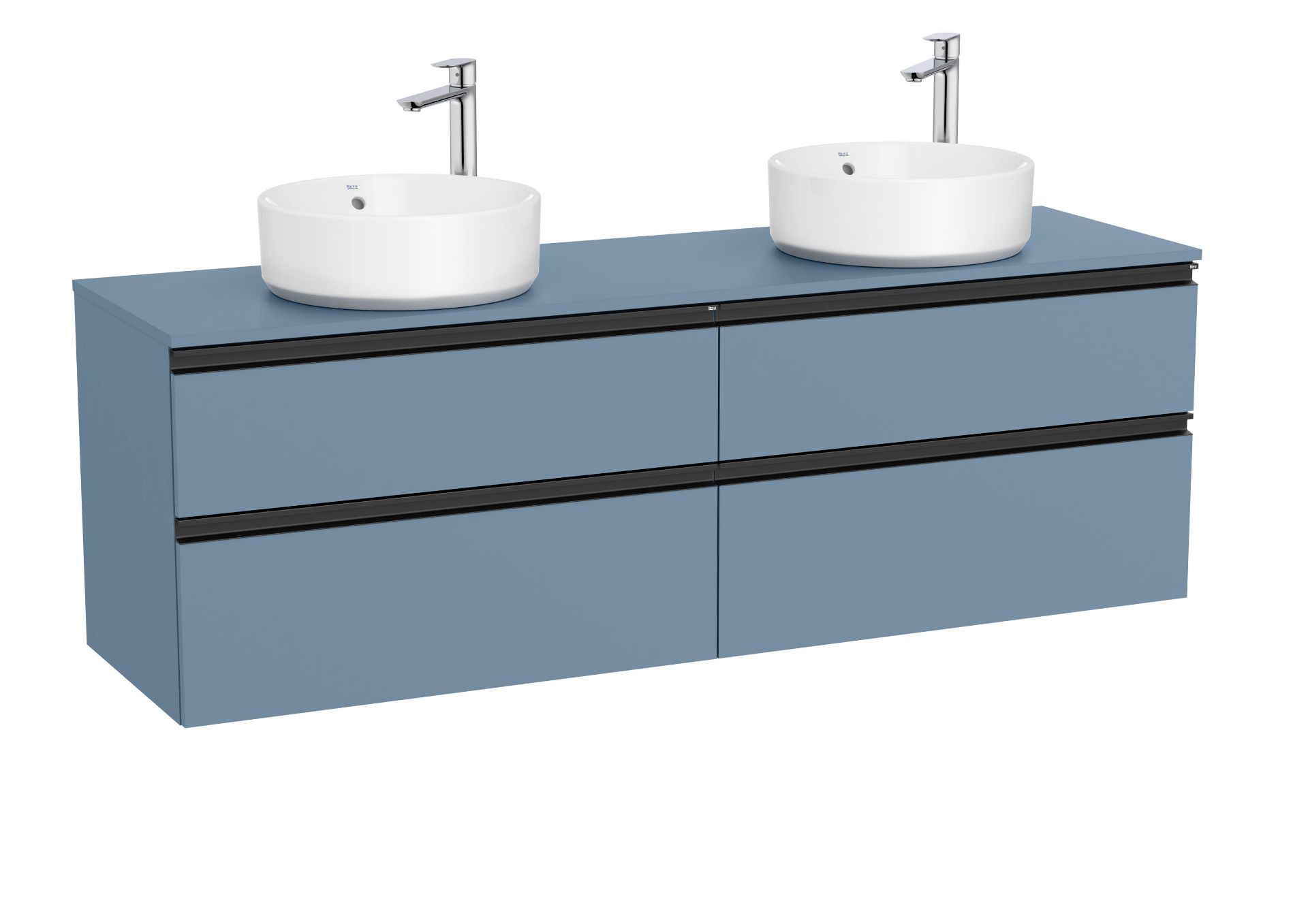 Unik GAP. Compuestos por mueble base modelo GAP cuatro cajones para dos lavabos sobreencimera compatibles. Acabado azul mate medida 1600x460. Cajones con cierre amortiguado. No incluye lavabo y grifería