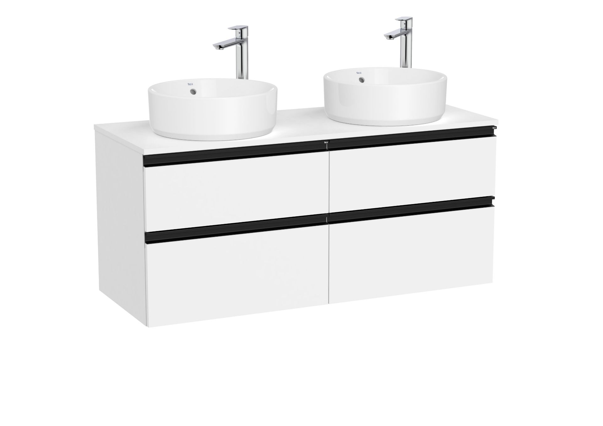 Unik GAP. Compuestos por mueble base modelo GAP cuatro cajones para dos lavabos sobreencimera compatibles. Acabado blanco mate medida 1200x460. Cajones con cierre amortiguado. No incluye lavabo y grifería