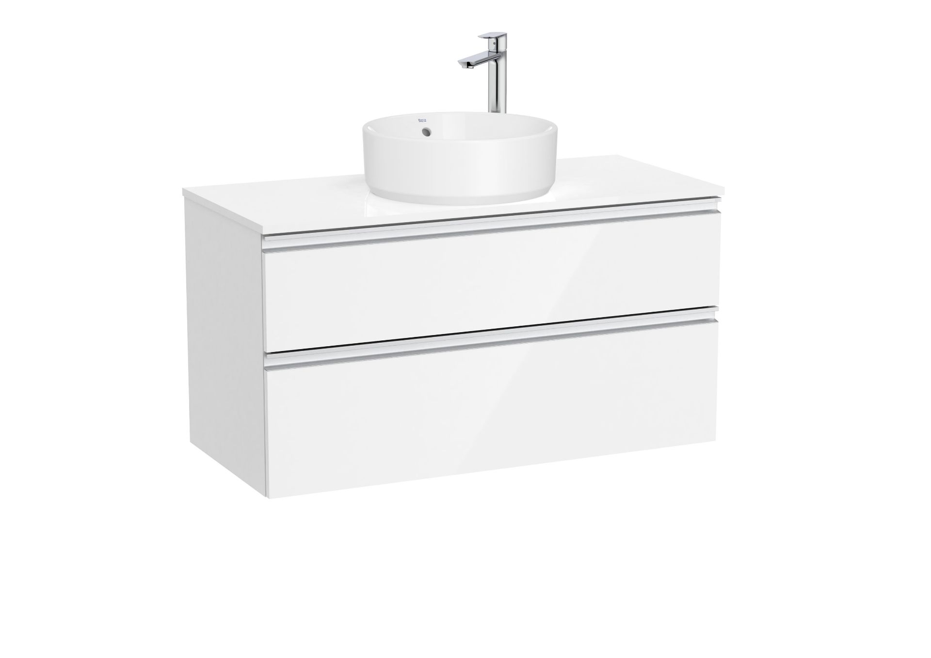 Unik GAP. Compuesto por mueble base modelo GAP dos cajones para lavabo sobreencimera compatible. Acabado blanco brillo medida 1000x460. Cajones con cierre amortiguado. No incluye lavabo y grifería