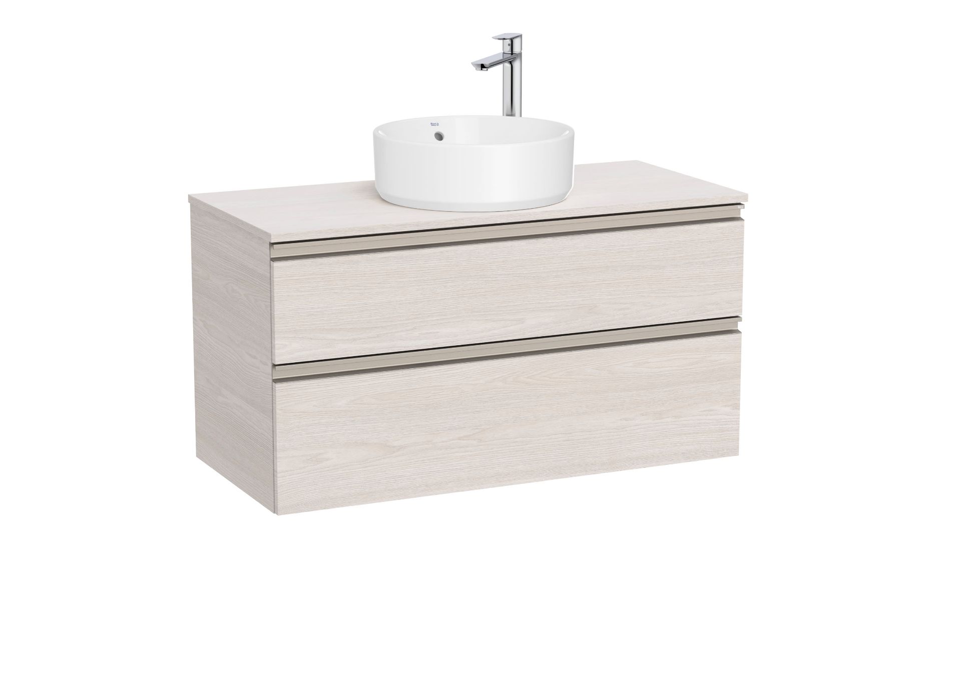 Unik GAP. Compuesto por mueble base modelo GAP dos cajones para lavabo sobreencimera compatible. Acabado fresno nórdico medida 1000x460. Cajones con cierre amortiguado. No incluye lavabo y grifería