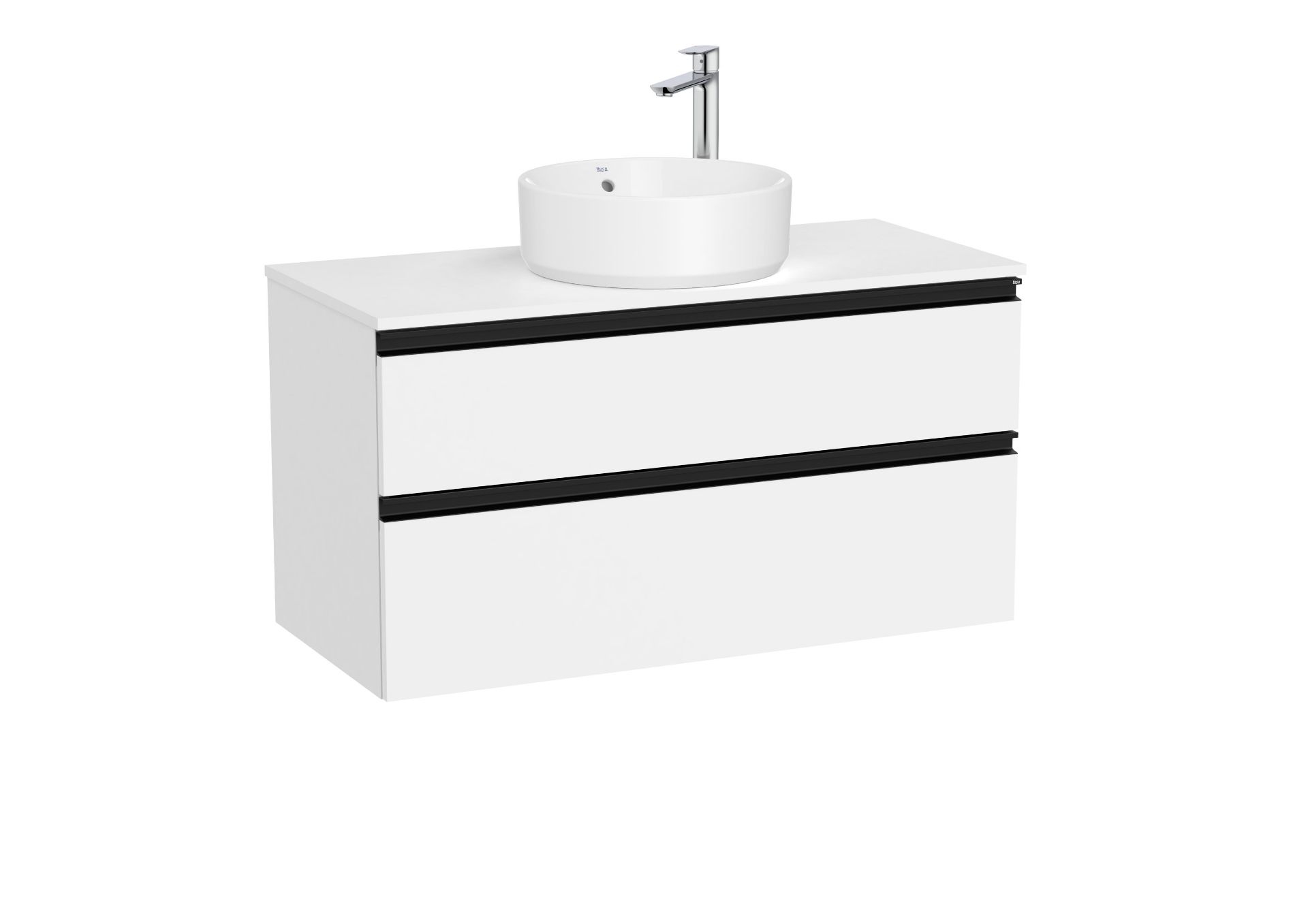 Unik GAP. Compuesto por mueble base modelo GAP dos cajones para lavabo sobreencimera compatible. Acabado blanco mate medida 1000x460. Cajones con cierre amortiguado. No incluye lavabo y grifería