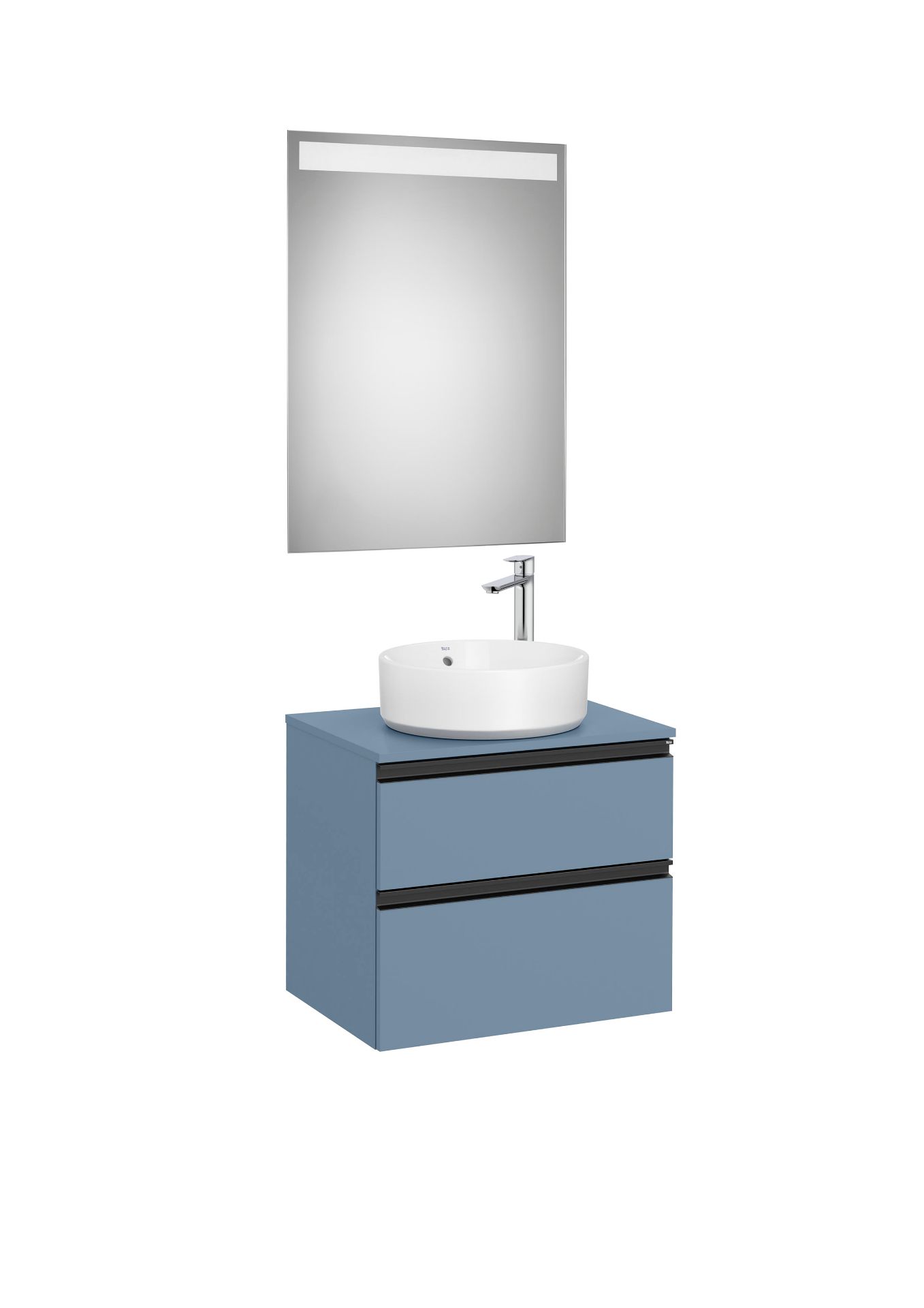 Pack GAP. Compuestos por mueble base modelo GAP dos cajones para lavabo sobreencimera compatible y espejo EIDOS . Acabado azul mate medida 600x460. Cajones con cierre amortiguado. No incluye lavabo y grifería