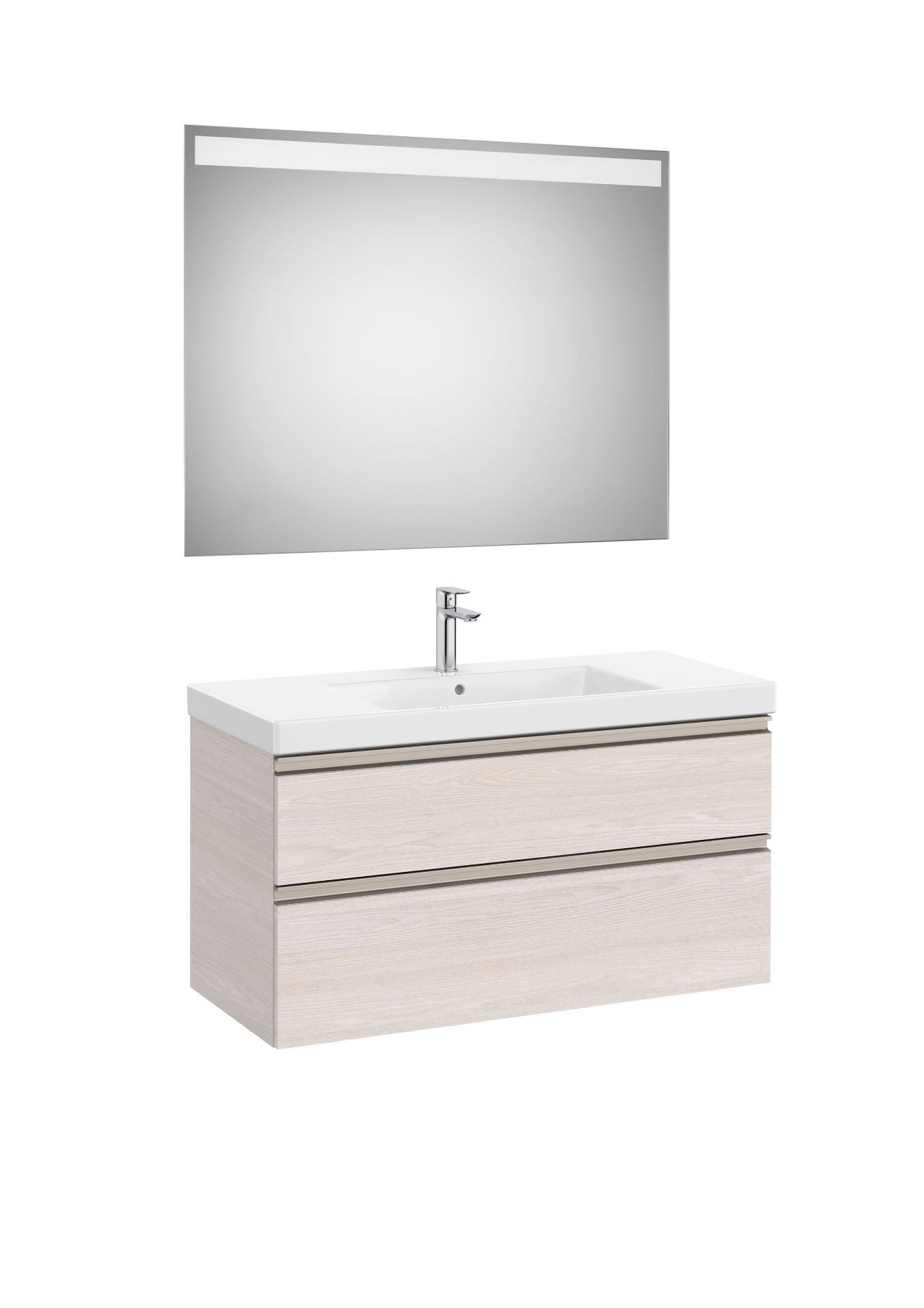 PACK, MUEBLE LAVABO PLUS Y ESPEJO, MODELO GAP 2 CAJONES CON LAVABO CENTRADO ACABADO FRESNO NORDICO. MEDIDA 1000X460