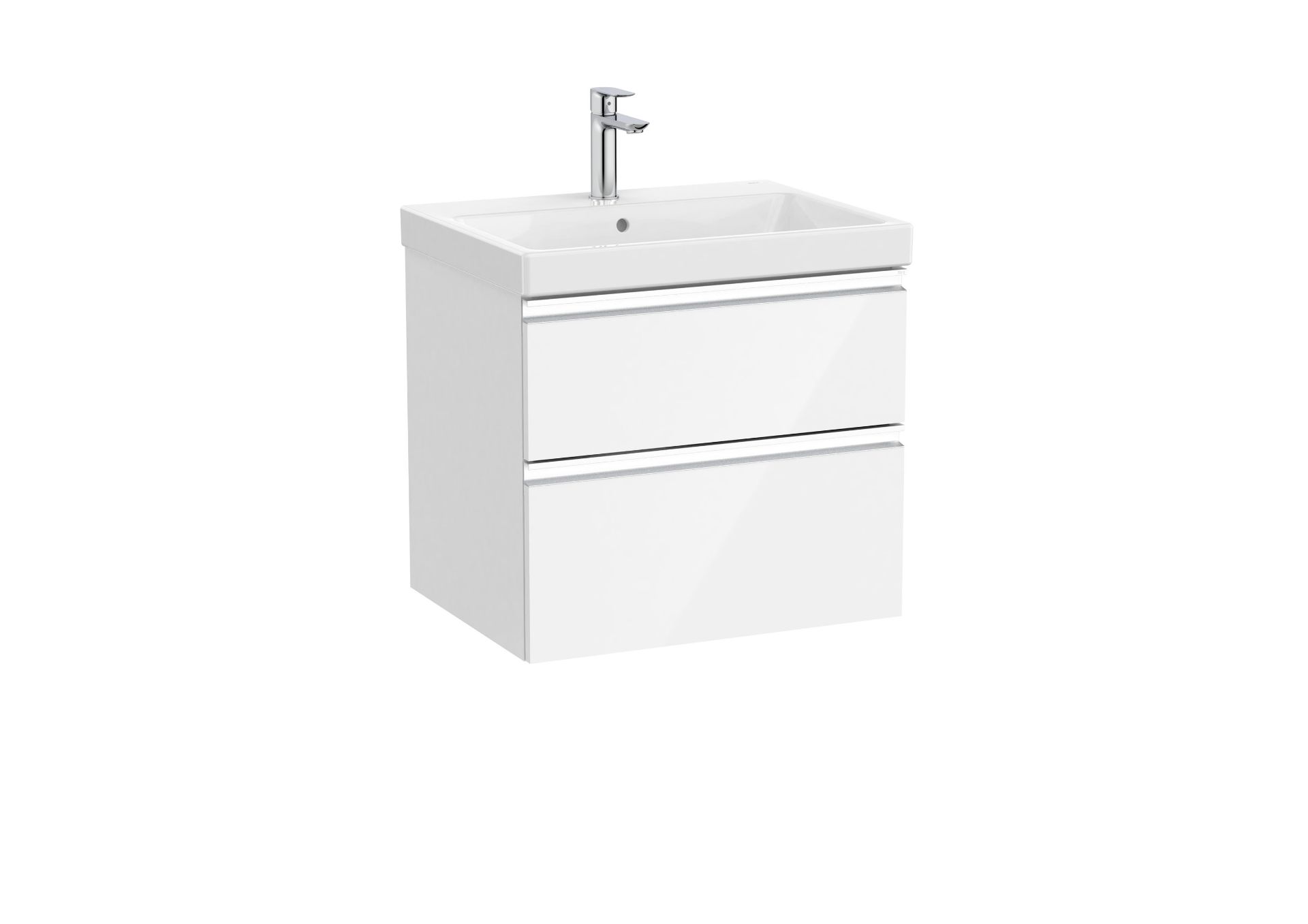 Unik GAP. Conjunto de mueble base dos cajones modelo GAP con lavabo Plus. Acabado blanco brillo medida 600x460. Cajones con cierre amortiguado. No incluye grifería