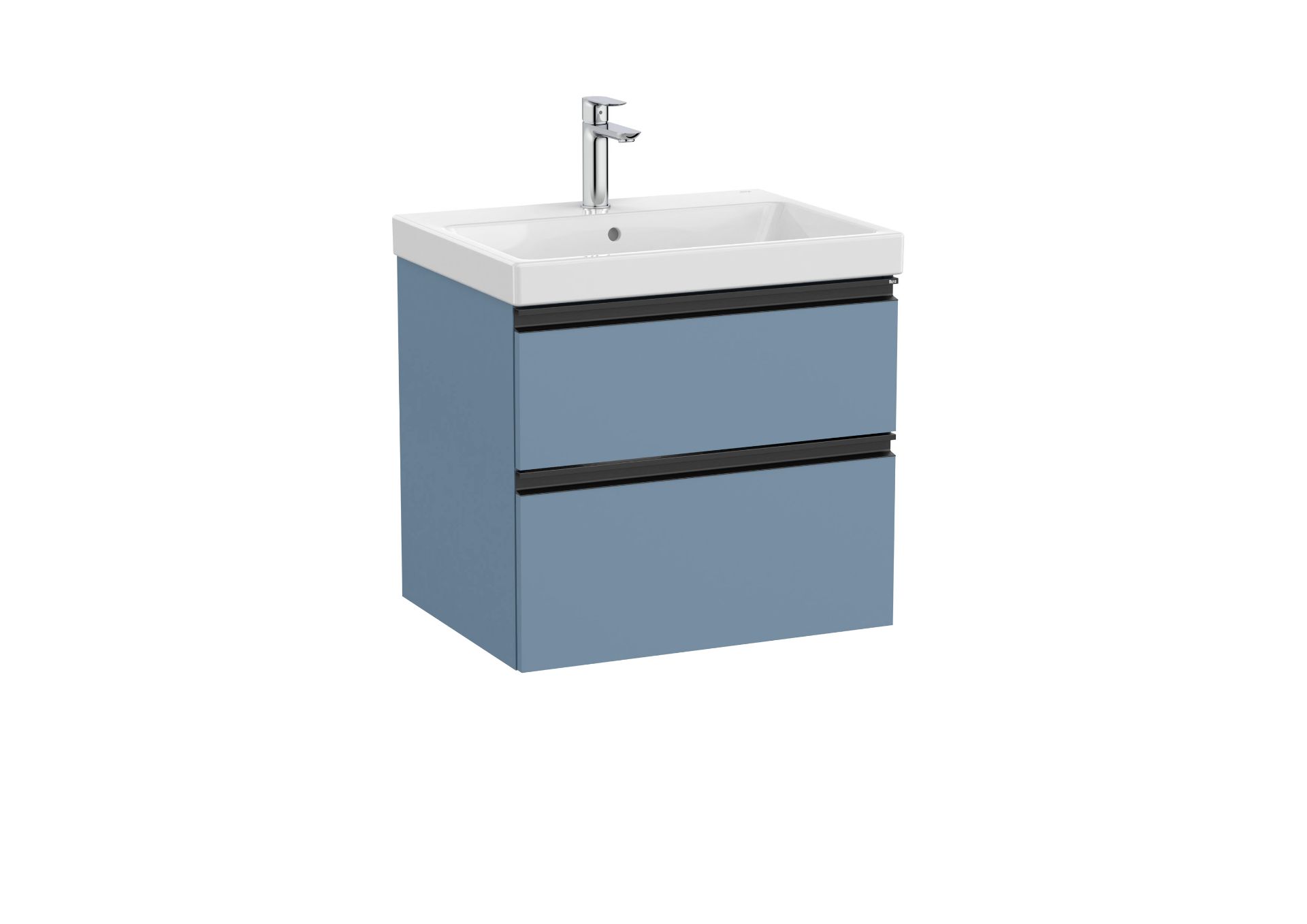 Unik GAP. Conjunto de mueble base dos cajones modelo GAP con lavabo Plus. Acabado azul mate medida 600x460. Cajones con cierre amortiguado. No incluye grifería