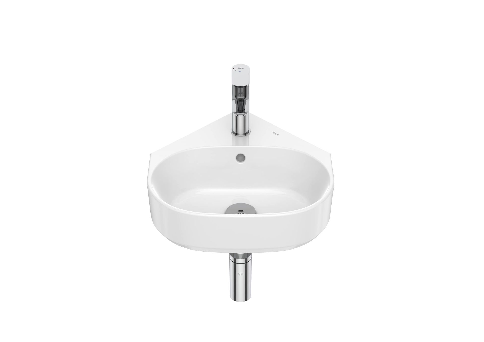 Lavabo de porcelana mural angular con juego de fijación. No incluye grifería.
