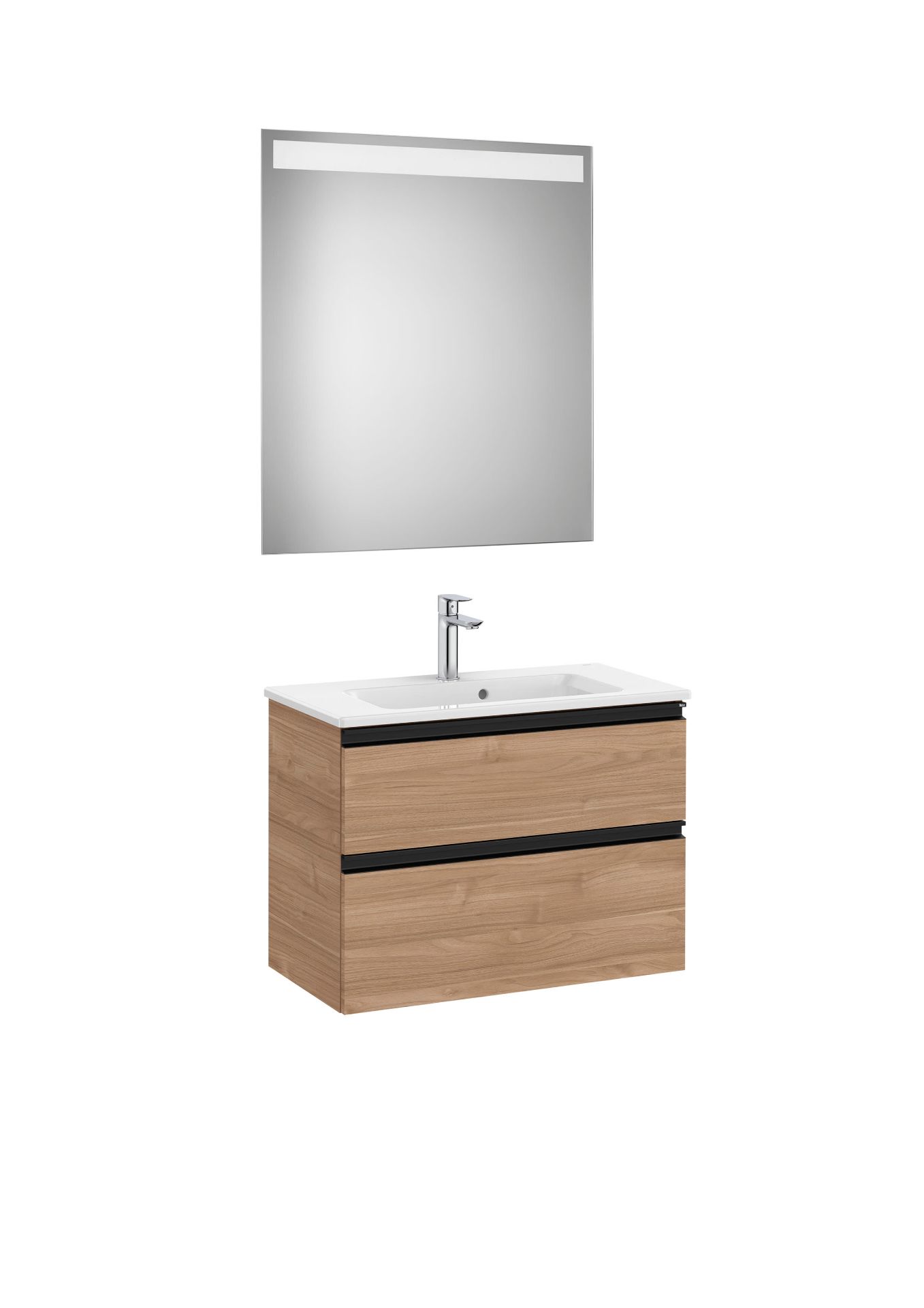 PACK - Conjunto de mueble base compacto de dos cajones con lavabo y espejo Eidos con luz LED integrada en la parte superior. No incluye patas ni grifería.
