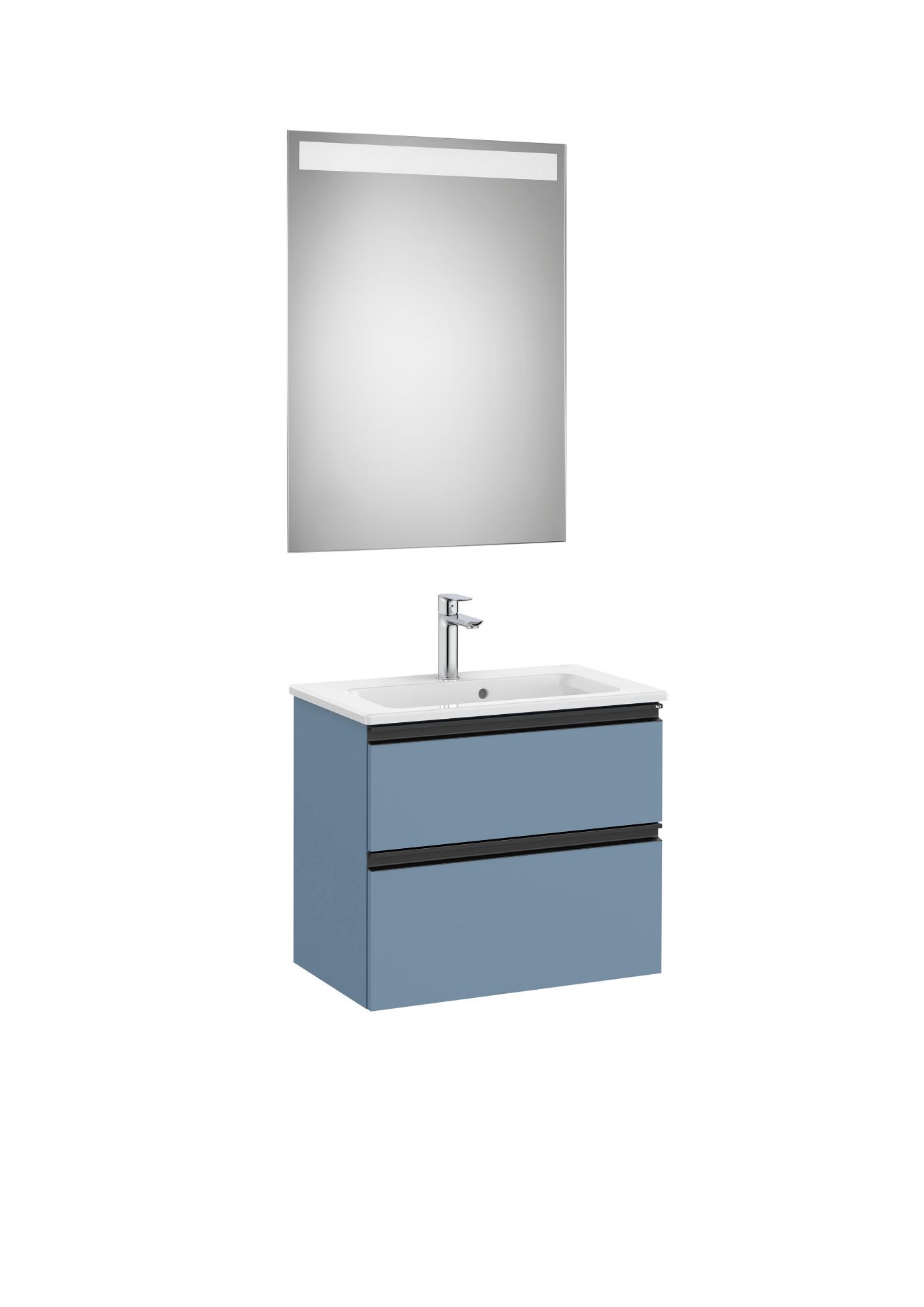 PACK COMPACTO, MUEBLE LAVABO Y ESPEJO, MODELO GAP 2 CAJONES ACABADO AZUL MATE CON LAVABO FONDO REDUCIDO. MEDIDA 600X380