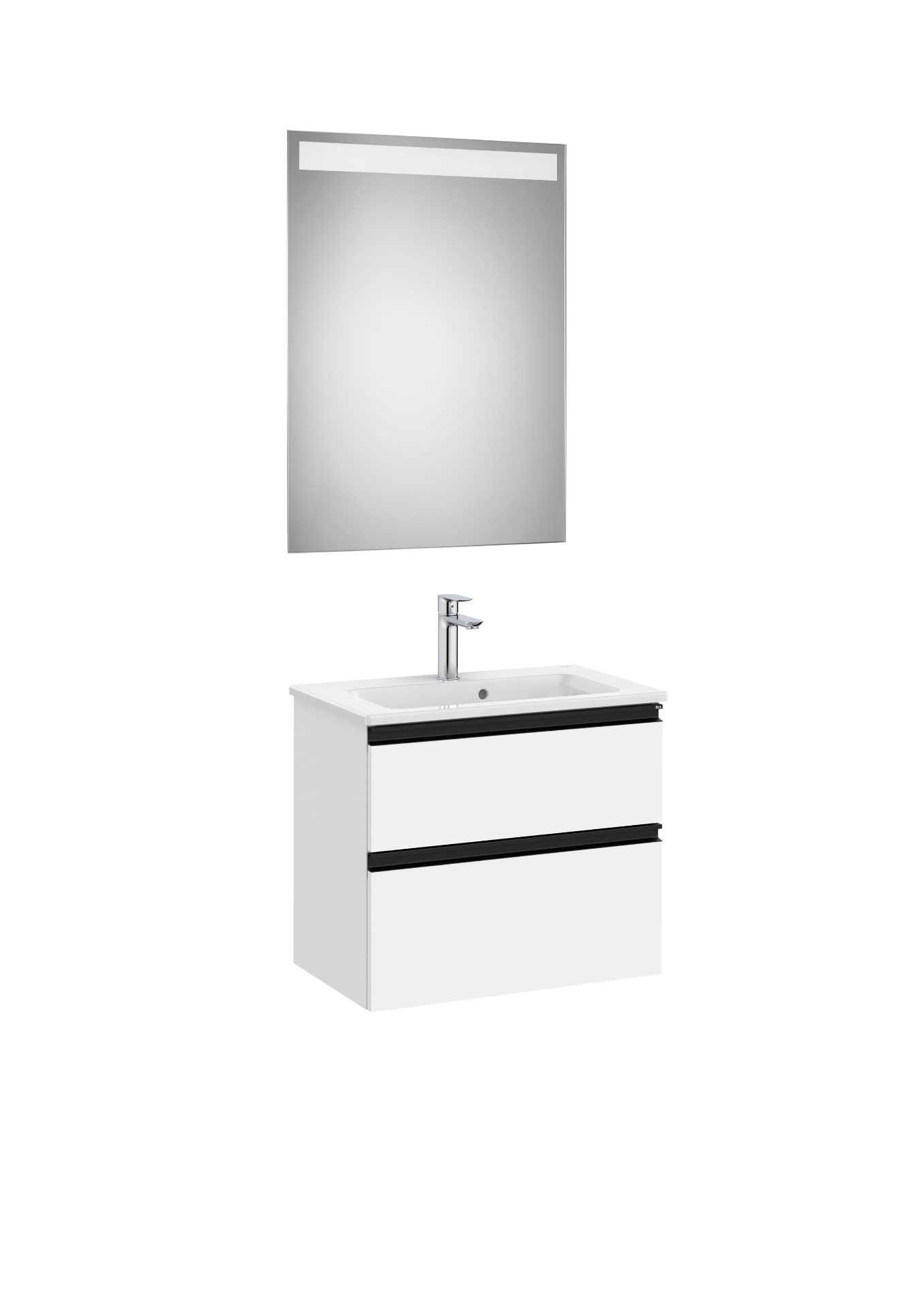 PACK - Conjunto de mueble base compacto de dos cajones con lavabo y espejo Eidos con luz LED integrada en la parte superior. No incluye patas ni grifería.