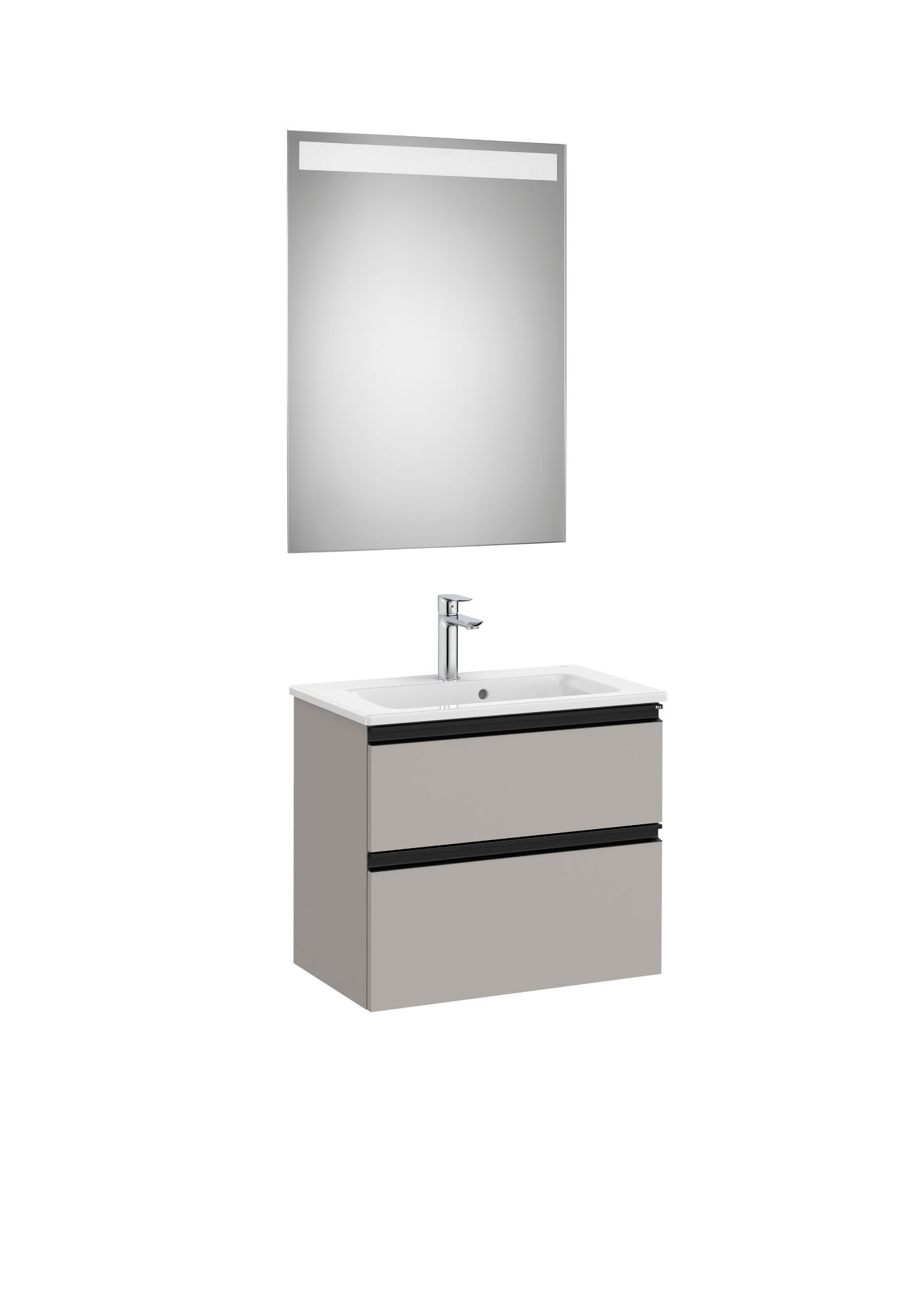 PACK - Conjunto de mueble base compacto de dos cajones con lavabo y espejo Eidos con luz LED integrada en la parte superior. No incluye patas ni grifería.