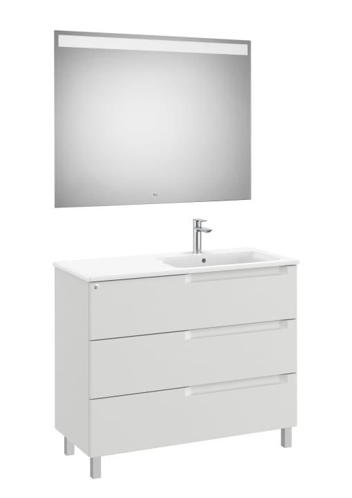 PACK - Conjunto de mueble base de tres cajones, lavabo a la derecha y espejo Eidos con luz LED integrada en la parte superior. No incluye patas ni grifería.
