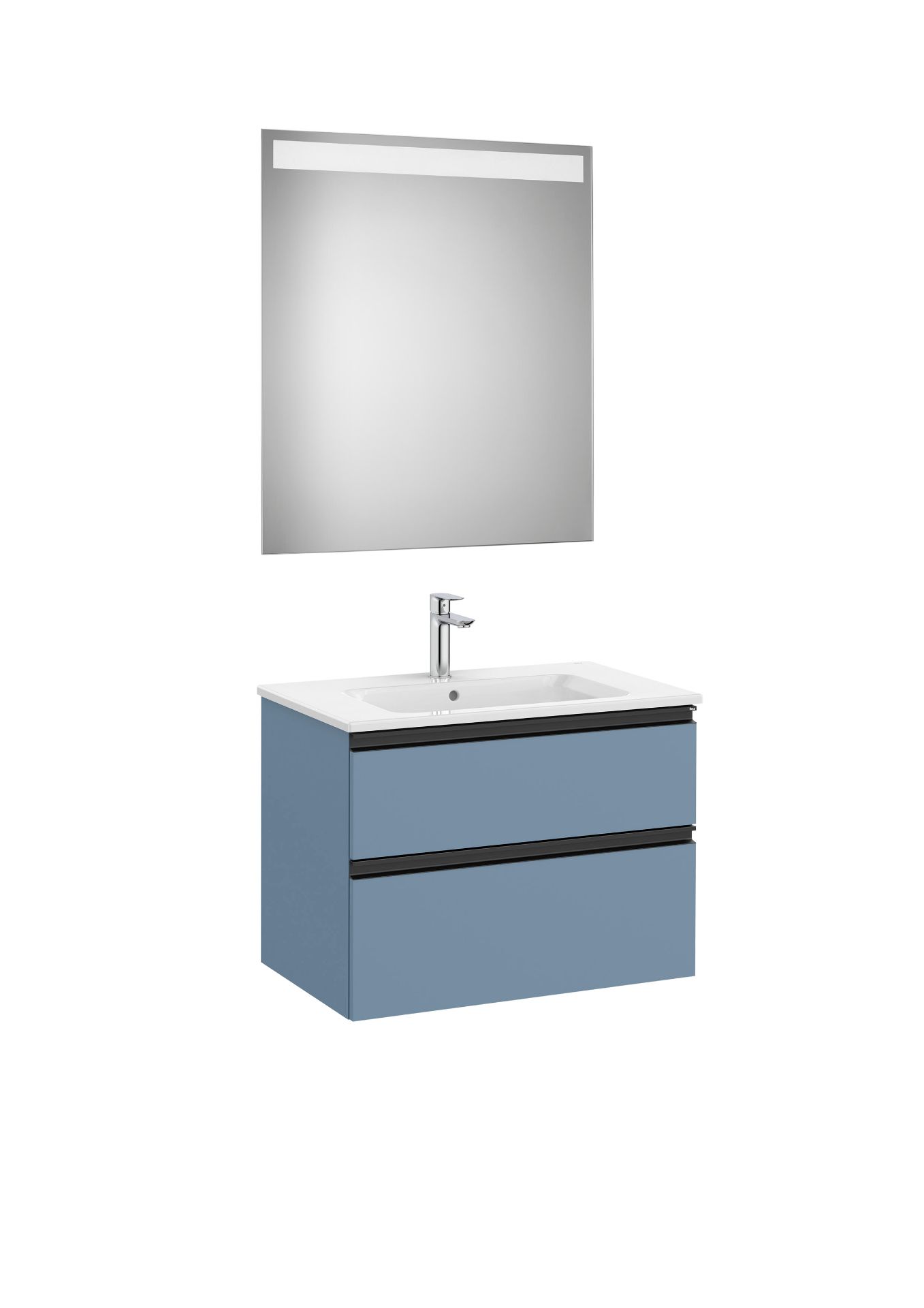 Pack GAP. Conjunto de mueble base dos cajones modelo GAP con lavabo centrado y espejo EIDOS . Acabado azul mate medida 700x460. Cajones con cierre amortiguado. No incluye grifería
