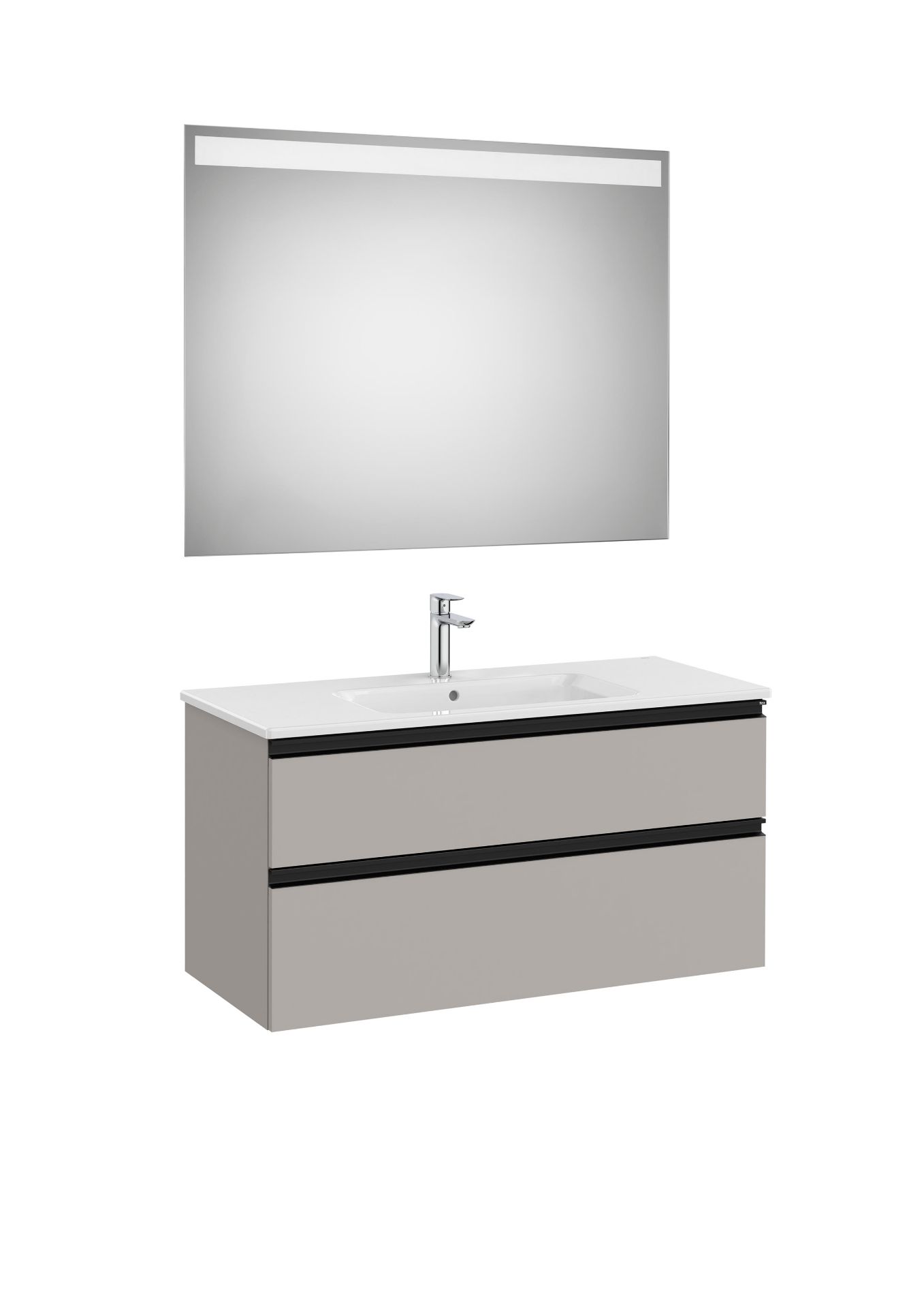 Pack GAP. Conjunto de mueble base dos cajones modelo GAP con lavabo centrado y espejo EIDOS . Acabado gris mate medida 1000x460. Cajones con cierre amortiguado. No incluye grifería