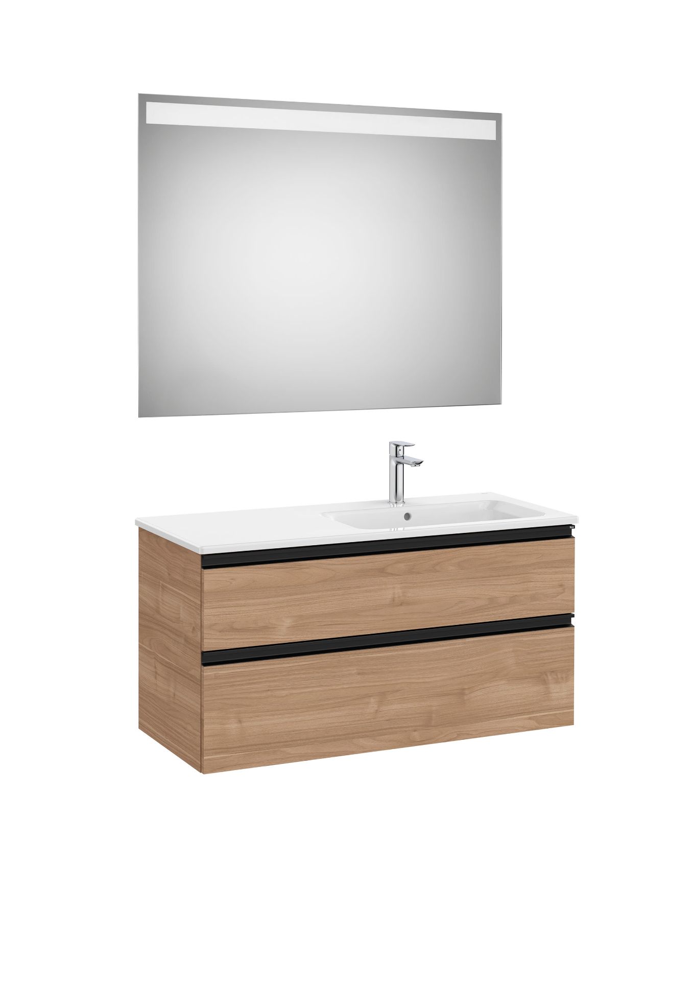 Pack GAP. Conjunto de mueble base dos cajones modelo GAP con lavabo desplazado a la derecha y espejo EIDOS . Acabado nogal medida 1000x460. Cajones con cierre amortiguado. No incluye grifería