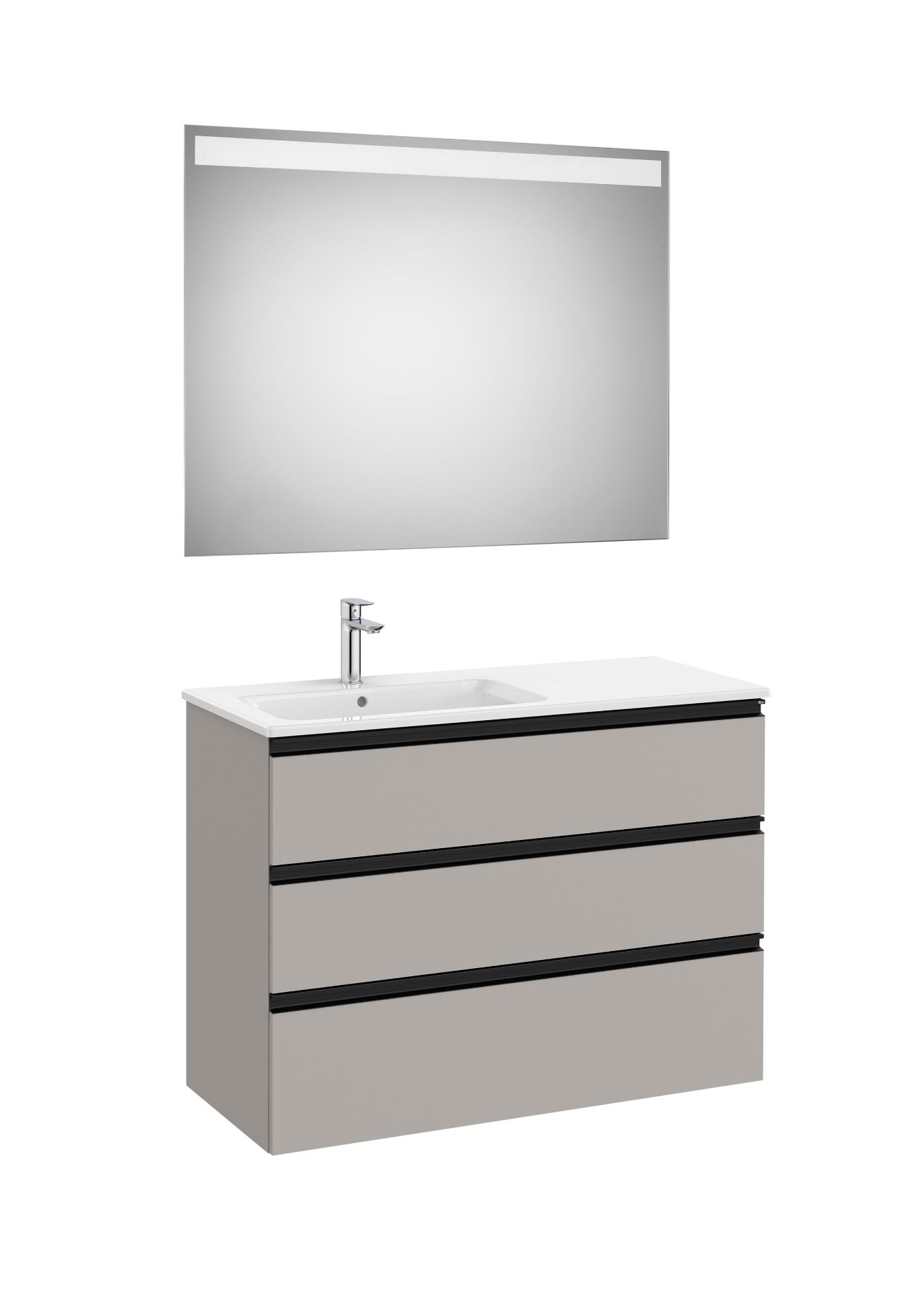 Pack GAP. Conjunto de mueble base tres cajones modelo GAP con lavabo desplazado a la izquierda y espejo EIDOS . Acabado gris mate medida 1000x460. Cajones con cierre amortiguado. No incluye grifería