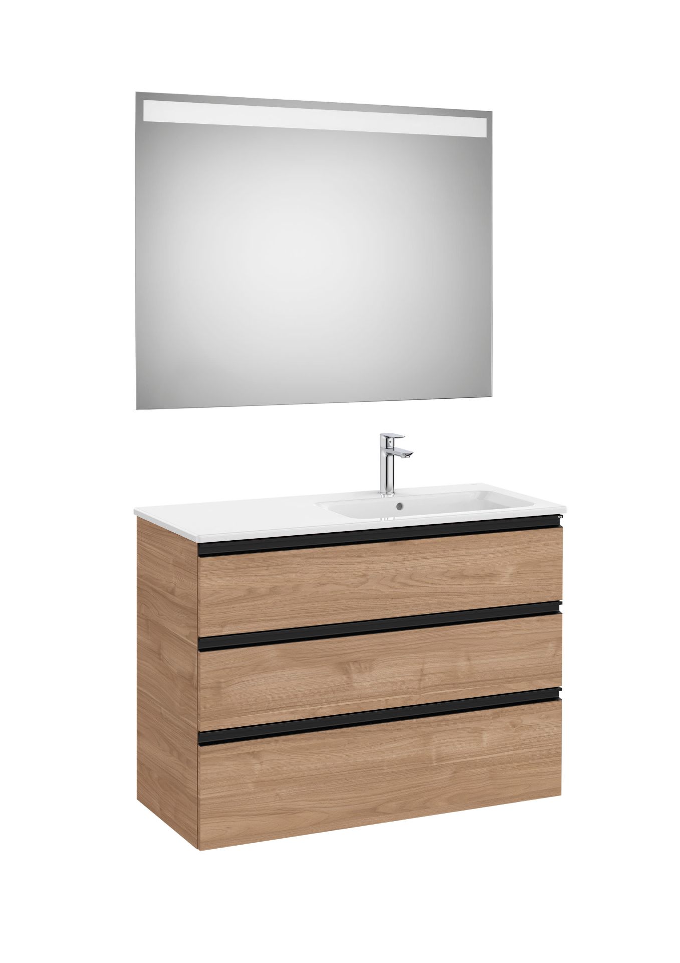 Pack GAP. Conjunto de mueble base tres cajones modelo GAP con lavabo desplazado a la derecha y espejo EIDOS . Acabado nogal medida 1000x460. Cajones con cierre amortiguado. No incluye grifería