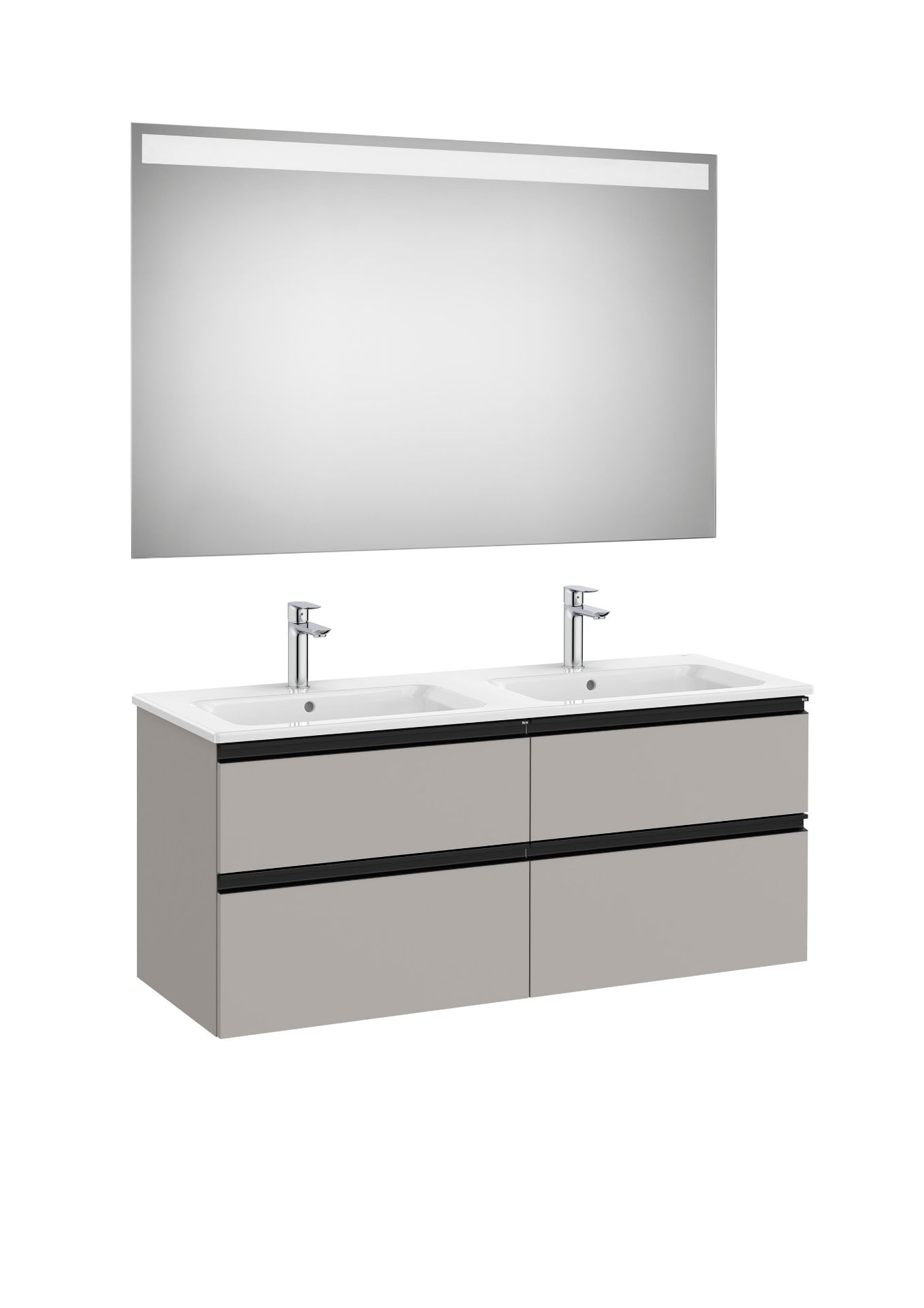 Pack GAP. Conjunto de mueble base cuatro cajones modelo GAP con lavabo doble y espejo EIDOS . Acabado gris mate medida 1200x460. Cajones con cierre amortiguado. No incluye grifería