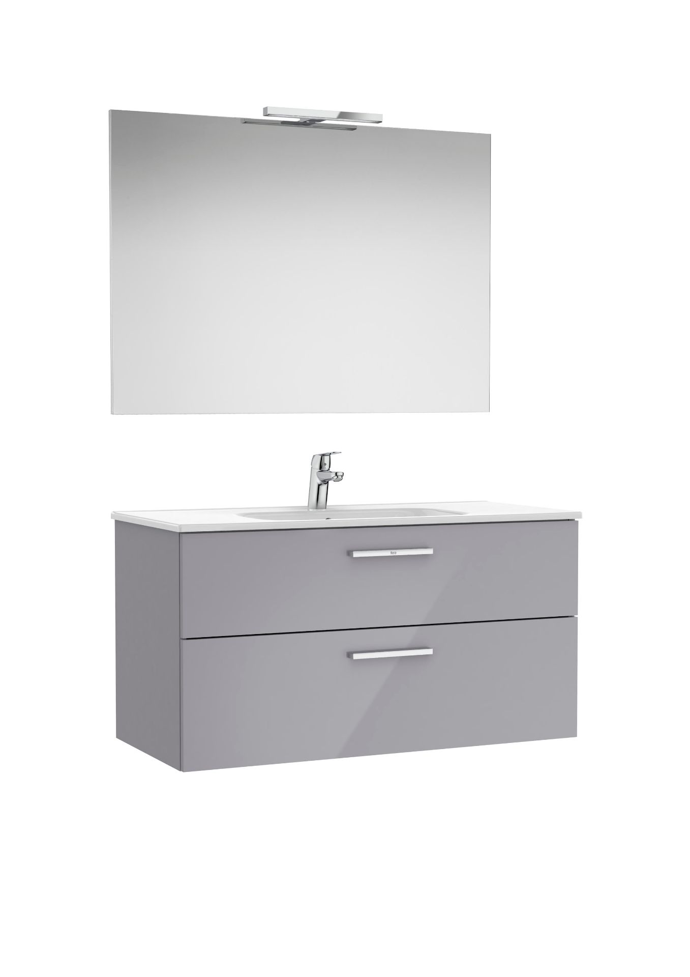 Pack VICTORIA. Conjunto de mueble base dos cajones modelo VICTORIA con lavabo centrado, espejo y aplique led . Acabado gris brillo medida 1000x453. Cajones con cierre amortiguado. No incluye grifería