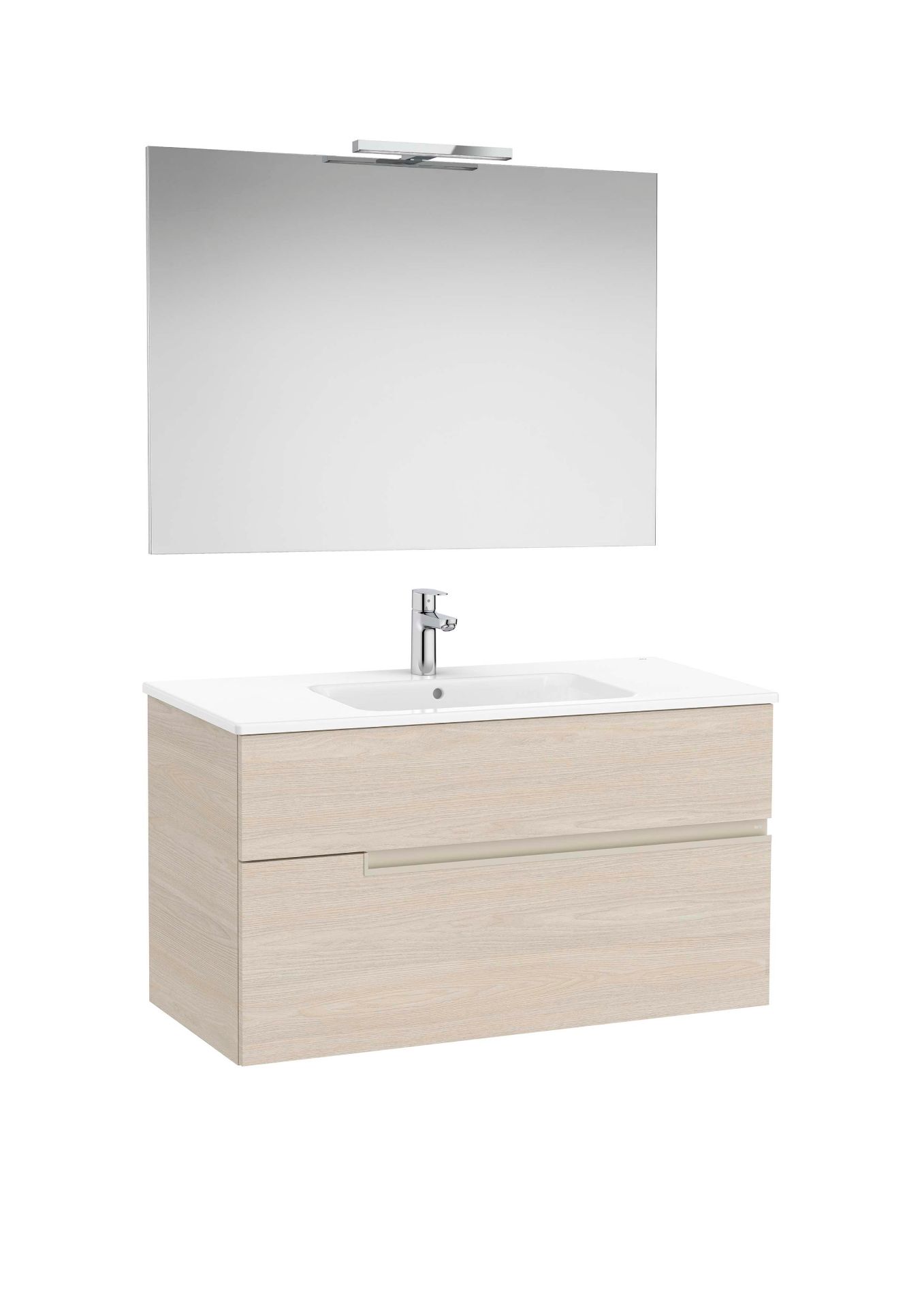 Pack VICTORIA-N versión 2024. Conjunto de mueble base dos cajones modelo VICTORIA-N con espejo LUNA y aplique LED Starlight . Acabado fresno claro medida 1000x460. Cajones con cierre amortiguado. No incluye grifería