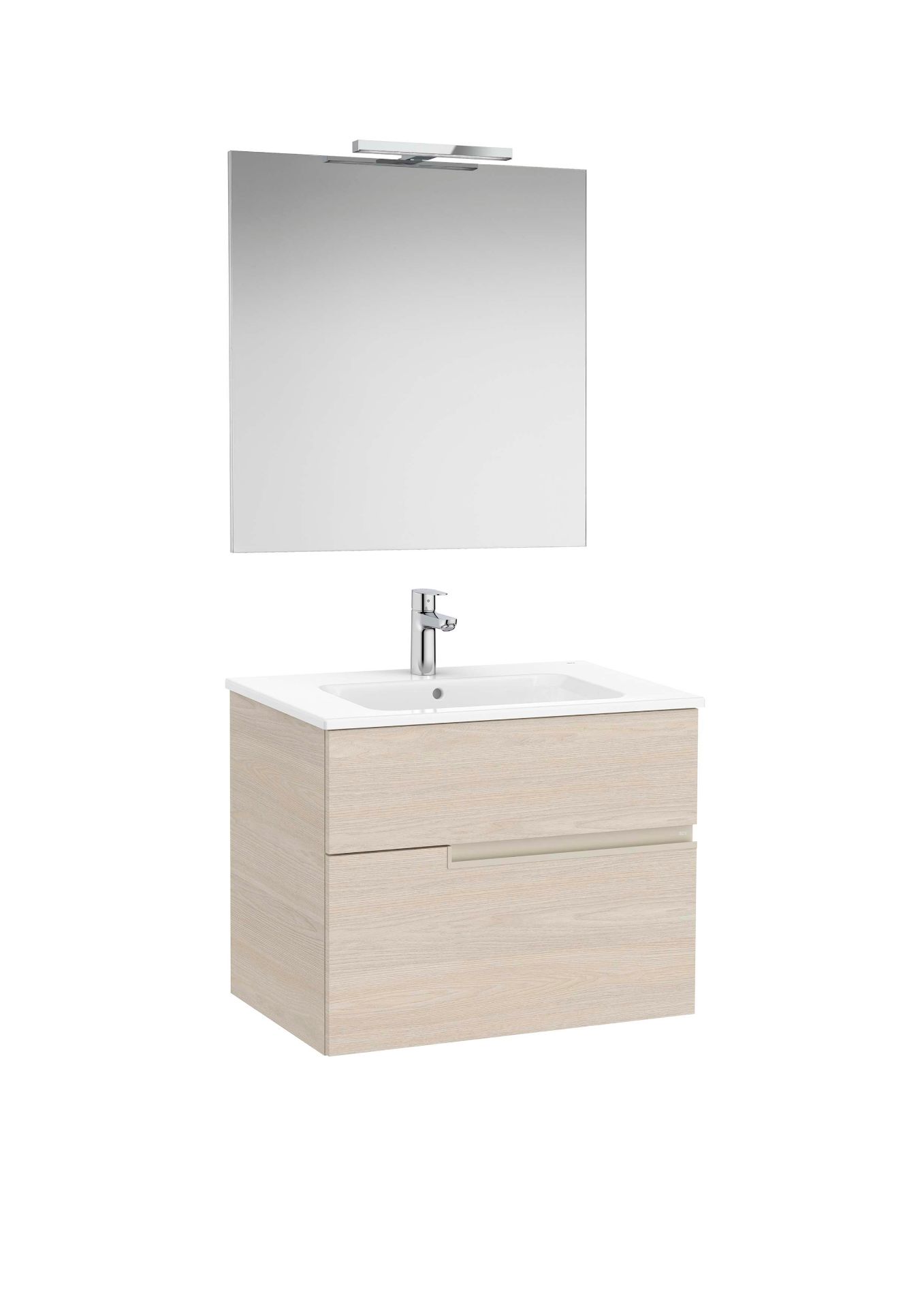 Pack VICTORIA-N versión 2024. Conjunto de mueble base dos cajones modelo VICTORIA-N con espejo LUNA y aplique LED Starlight . Acabado fresno claro medida 700x460. Cajones con cierre amortiguado. No incluye grifería