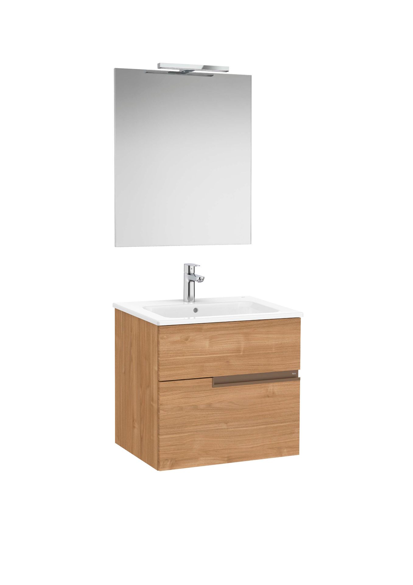 Pack VICTORIA-N versión 2024. Conjunto de mueble base dos cajones modelo VICTORIA-N con espejo LUNA y aplique LED Starlight . Acabado nogal medida 600x460. Cajones con cierre amortiguado. No incluye grifería