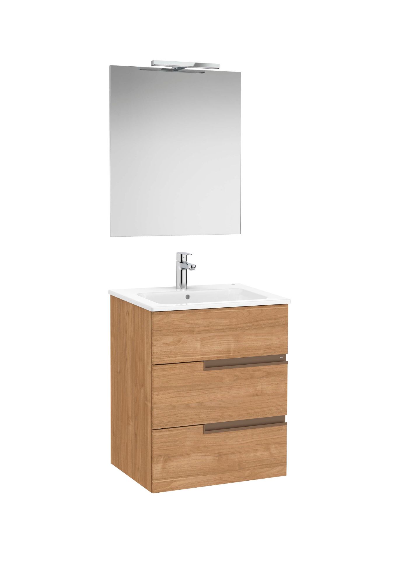 Pack VICTORIA-N versión 2024. Conjunto de mueble base tres cajones modelo VICTORIA-N con espejo LUNA y aplique LED Starlight . Acabado nogal medida 600x460. Cajones con cierre amortiguado. No incluye grifería