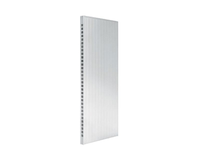 Panel vertical acero. Frontal con suaves relieves lineales. Apto para instalación bitubo. Color blanco RAL 9016. Accesorios de instalación incluidos. Disponible en Alturas 1500, 1800 y 2000 mm