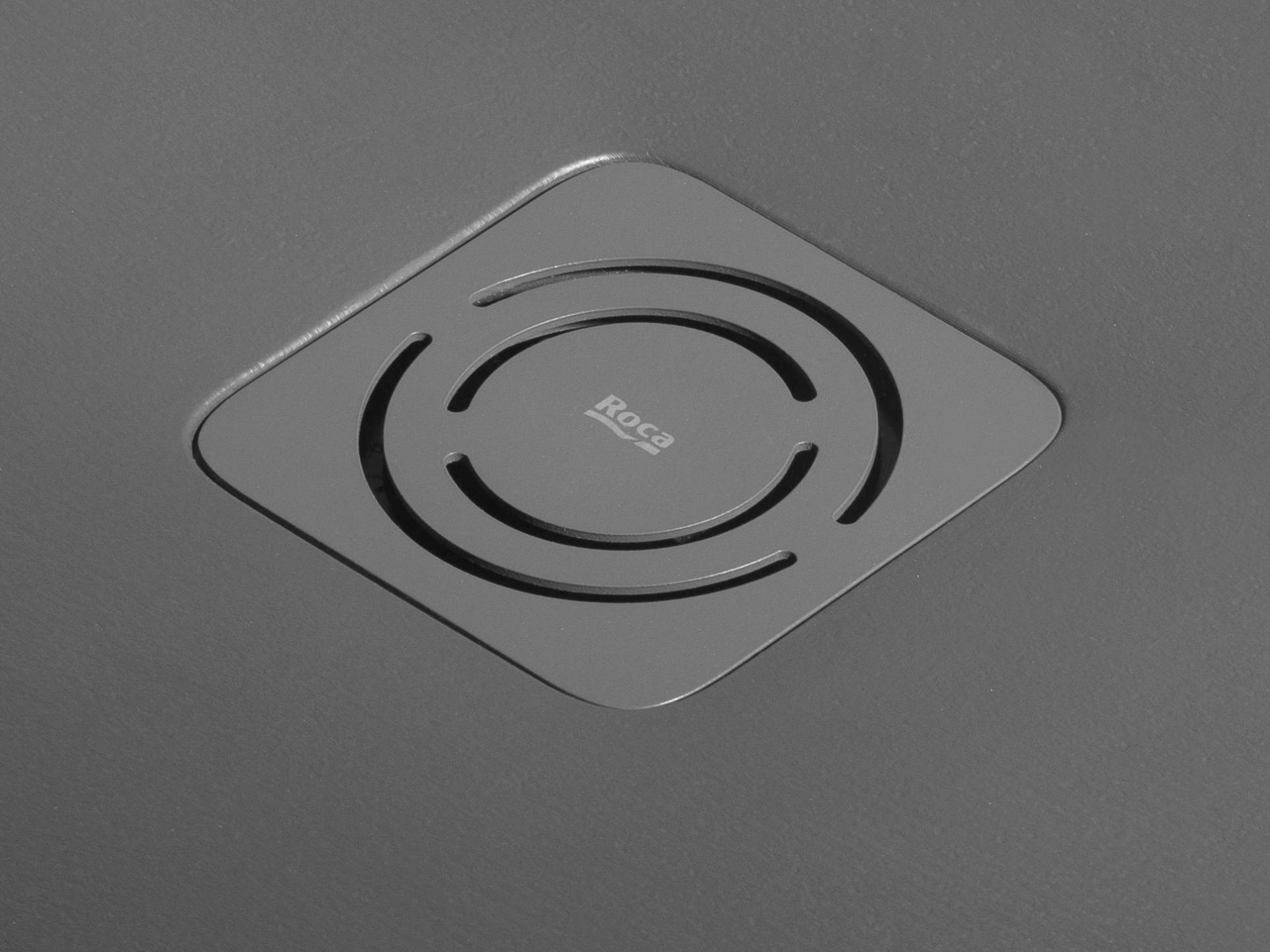 Superficie antideslizante con textura grava. Extraplano. Incluye desagüe de gran caudal y rejilla Twist en el mismo acabado de color.