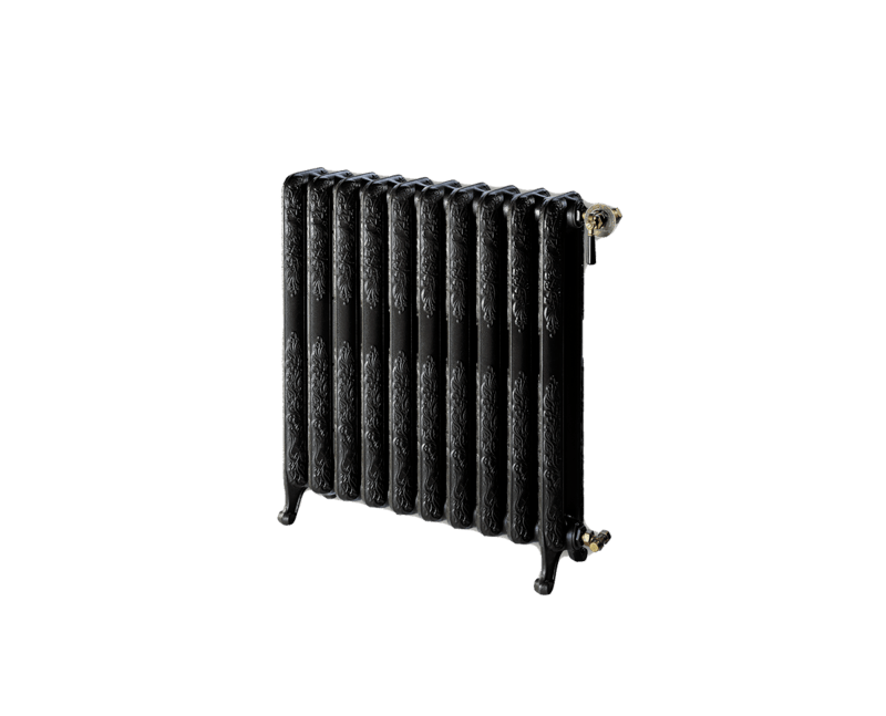 Radiador con gran resistencia a la corrosión, altura 838 mm y ancho 755 mm con dos columnas. Tapones y reducciones montados en el radiador, acabado color negro acabado brillante Suministro en baterias de 4, 6, 8 y 10 elementos.