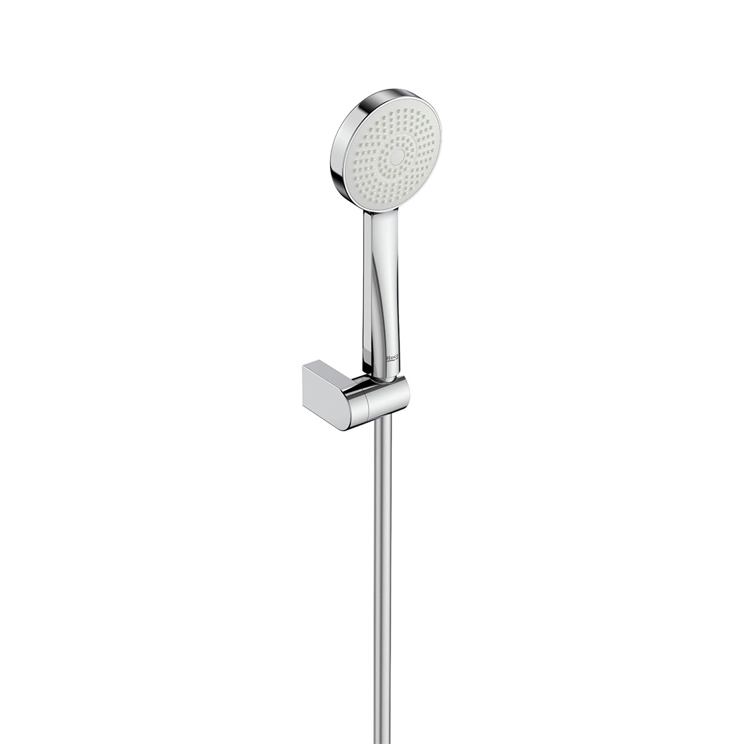Set de ducha STELLA-N cromado. Incluye ducha de mano de 100 mm con 1 salida de agua con ahorro de agua con un caudal de 6L/min, soporte articulado y flexible de PVC de 1,70 m. No incluye grifería.