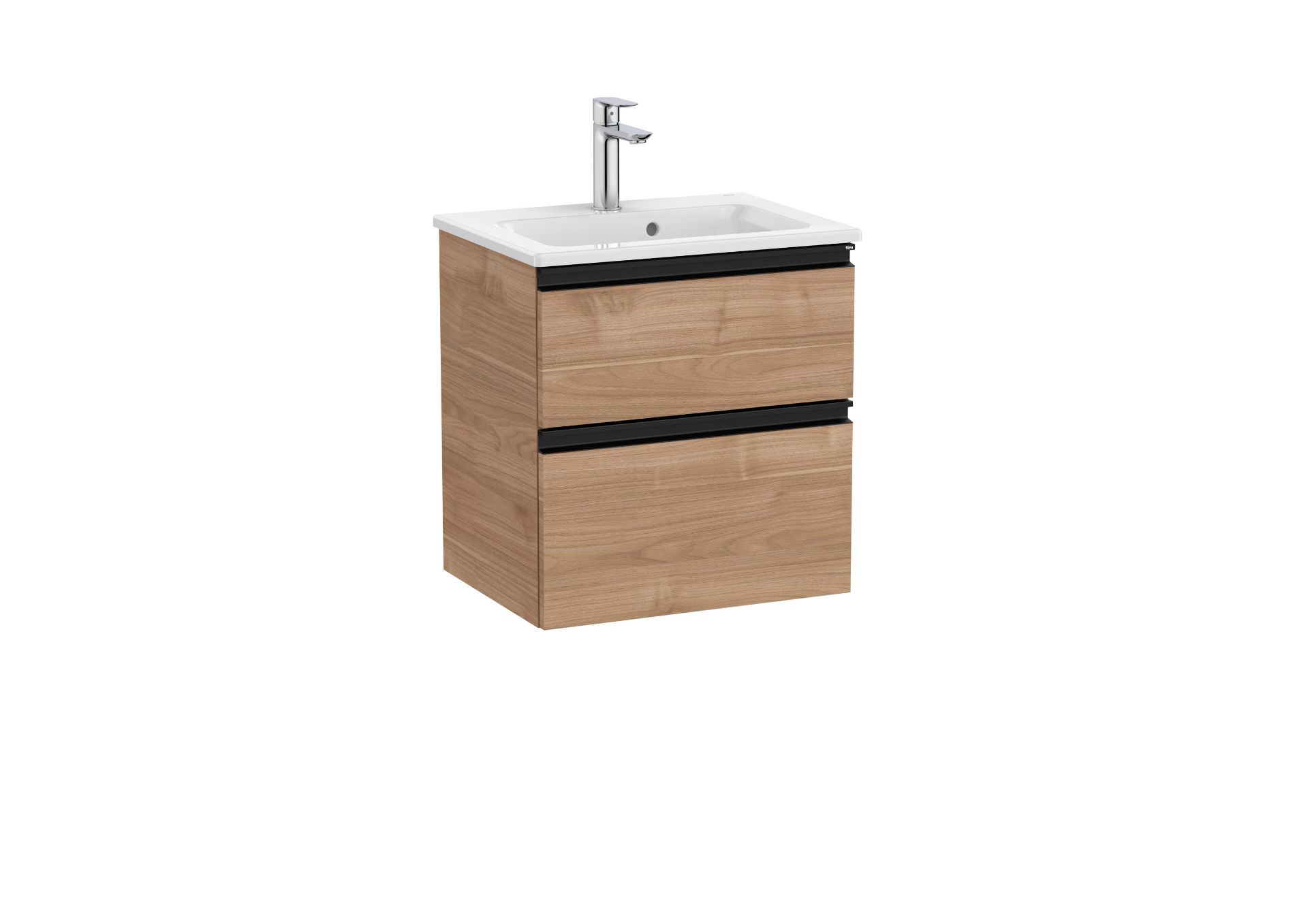 Unik GAP compac . Conjunto de mueble base dos cajones modelo GAP dos cajones y lavabo compacto fondo reducido. Acabado nogal medida 500x380. Cajones con cierre amortiguado. No incluye grifería