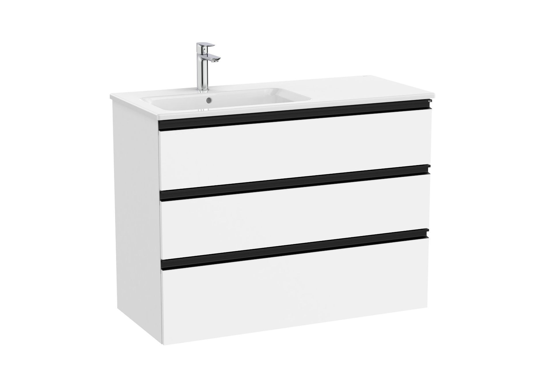 Unik GAP. Conjunto de mueble base tres cajones modelo GAP y lavabo desplazado a la izquierda. Acabado blanco mate medida 1000x460. Cajones con cierre amortiguado. No incluye grifería