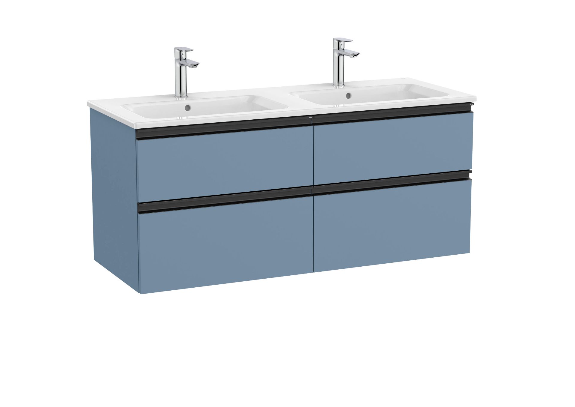 Unik GAP. Conjunto de mueble base cuatro cajones modelo GAP y lavabo doble. Acabado azul mate medida 1200x460. Cajones con cierre amortiguado. No incluye grifería