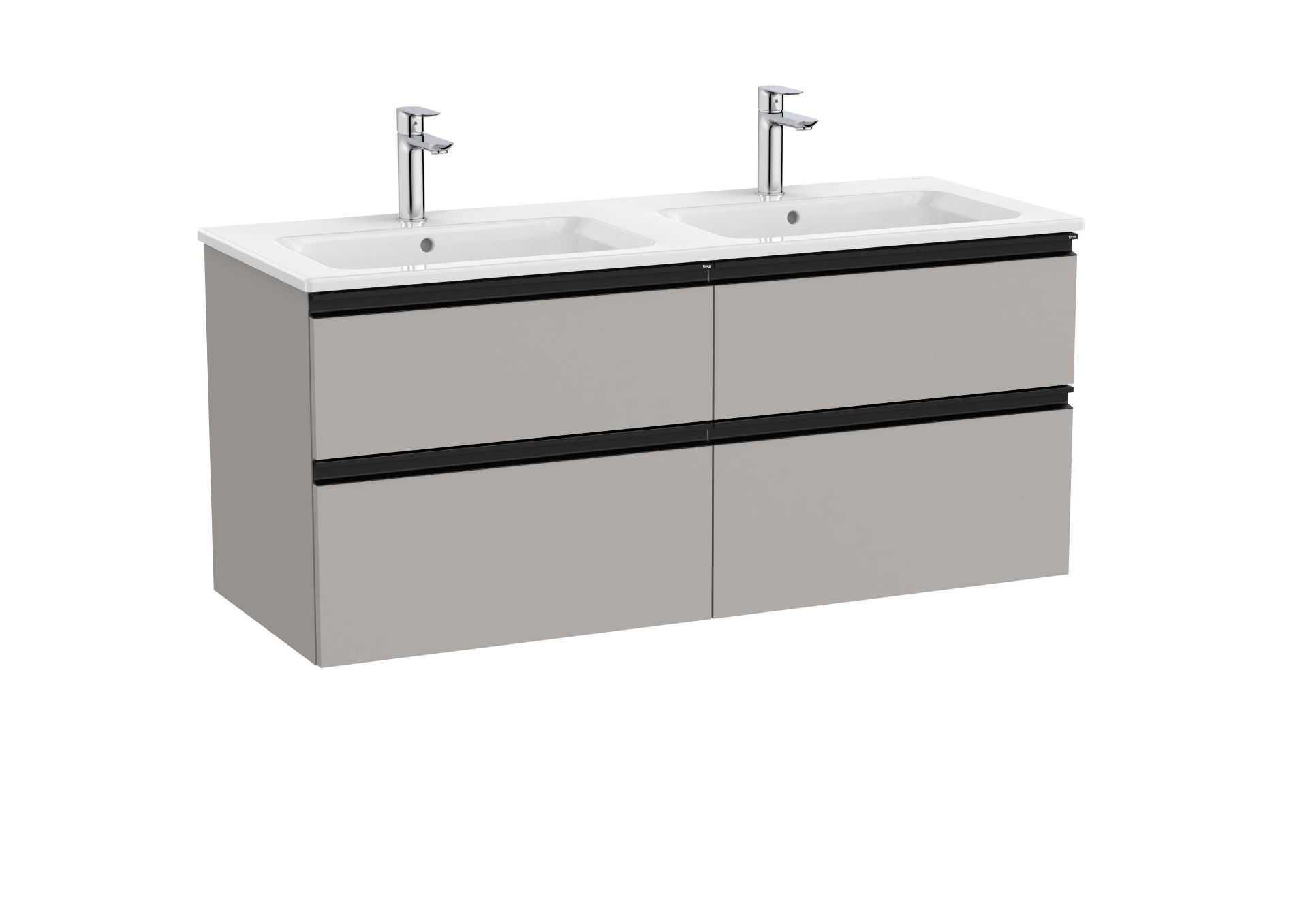 Unik GAP. Conjunto de mueble base cuatro cajones modelo GAP y lavabo doble. Acabado gris mate medida 1200x460. Cajones con cierre amortiguado. No incluye grifería