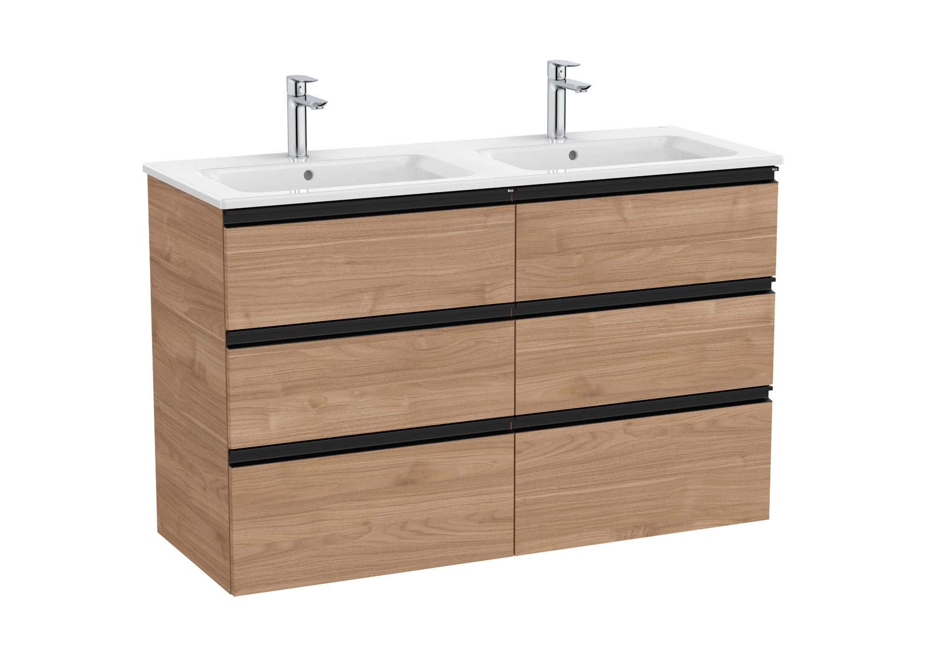 Unik GAP. Conjunto de mueble base seis cajones modelo GAP y lavabo doble. Acabado nogal medida 1200x460. Cajones con cierre amortiguado. No incluye grifería