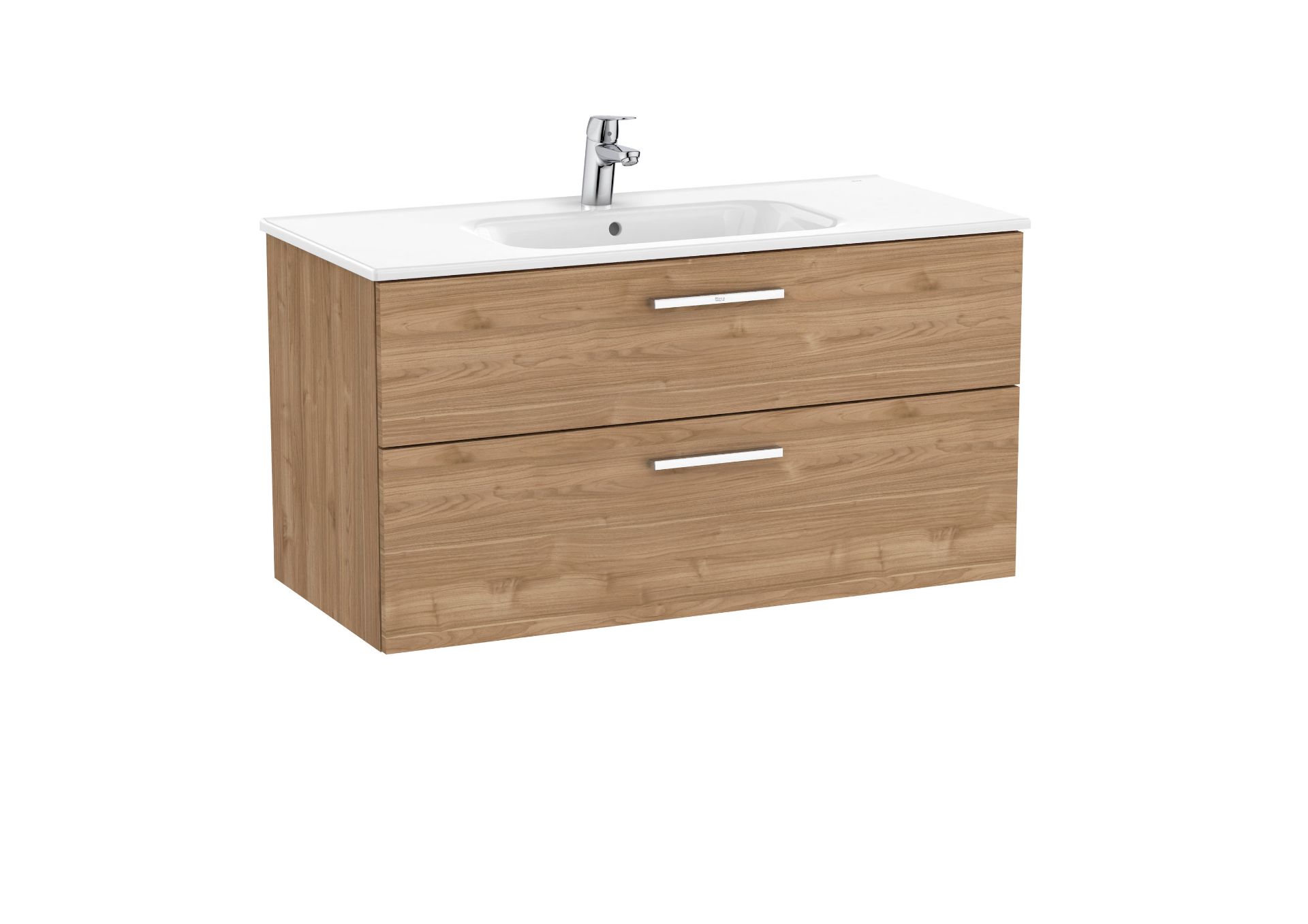 Unik VICTORIA. Conjunto de mueble base dos cajones modelo VICTORIA y lavabo centrado. Acabado nogal medida 1000x453. Cajones con cierre amortiguado. No incluye grifería
