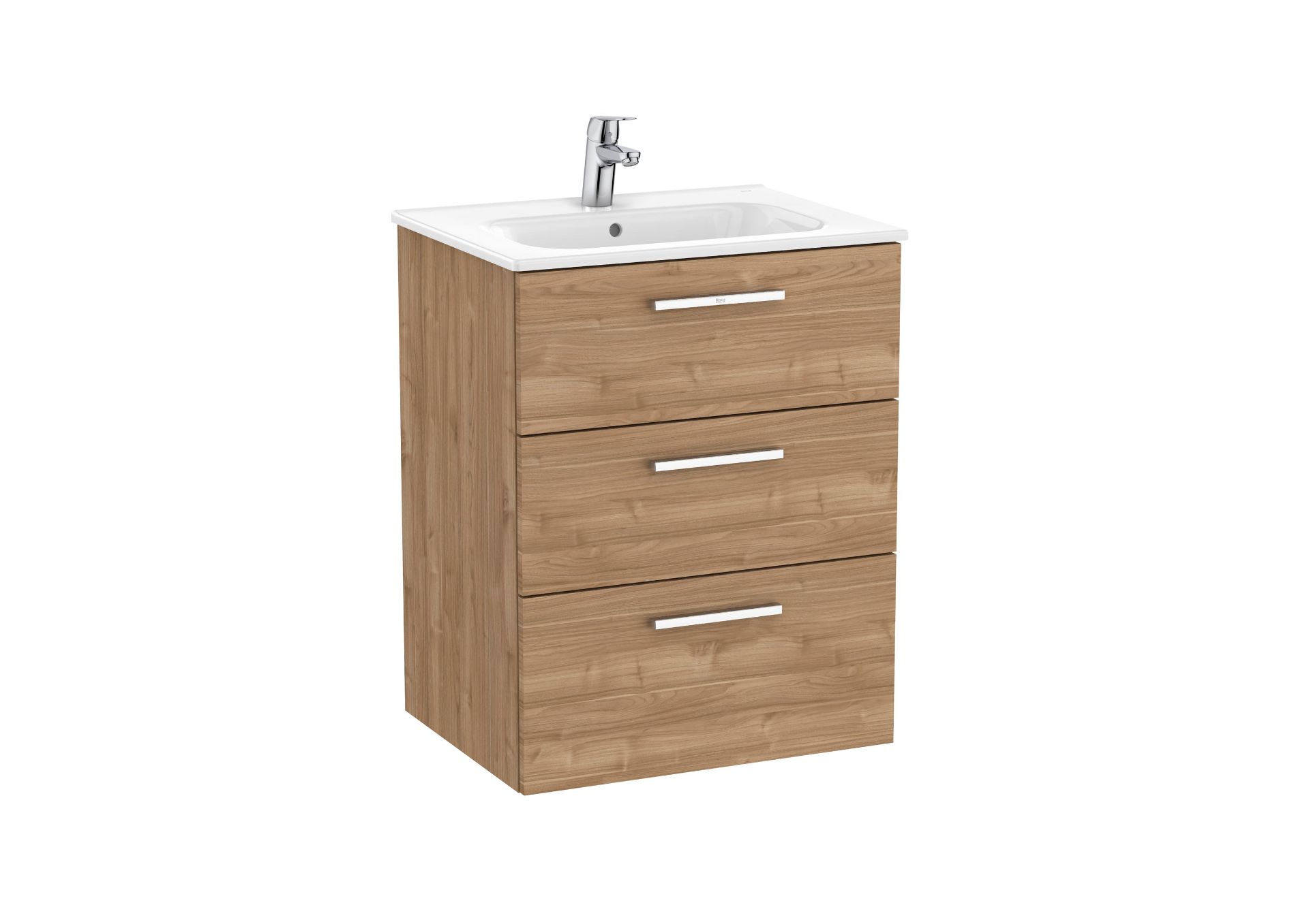 Unik VICTORIA FAMILY. Conjunto de mueble base tres cajones modelo VICTORIA FAMILY y lavabo centrado. Acabado nogal medida 600x453. Cajones con cierre amortiguado. No incluye grifería
