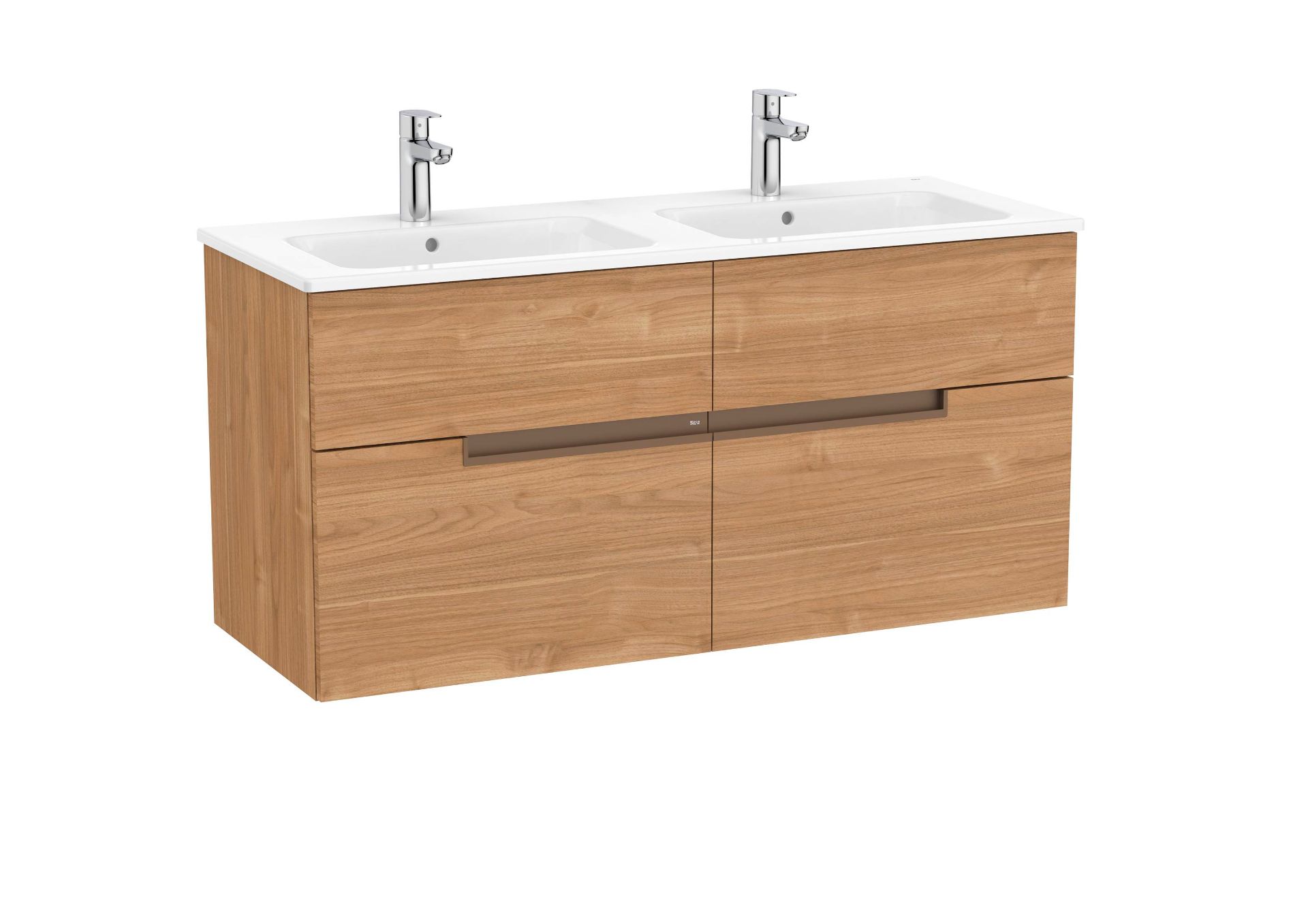 Unik VICTORIA-N versión 2024. Conjunto de mueble base cuatro cajones modelo VICTORIA-N y lavabo doble. Acabado nogal medida 1200x460. Cajones con cierre amortiguado. No incluye grifería